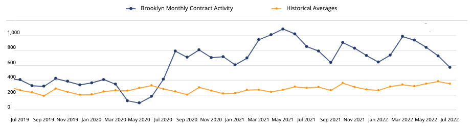 Brooklyn real estate, measured by contract activity, slowed down considerably in July, with 21% fewer contracts being signed compared to the prior month. While the contract activity trends may lend itself to a short term pessimistic outlook on Brooklyn real estate, buyer activity in the form of inquiries, showings and offers picked up in the second half of July. Has the market seen the low in terms of buyer demand? It’s too early to be certain, however there are positive signals at play.