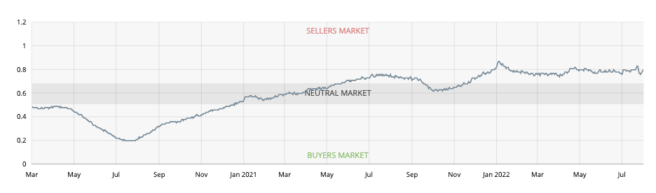 As measured by signed contracts, decreased 21% compared to June as 572 contracts signed in July. Compared to July 2021, 33% fewer contracts were signed this year. Despite the sharp decrease in contract volume compared to last July, this year’s contract volume remains well above the average in July of 2015 through 2019.