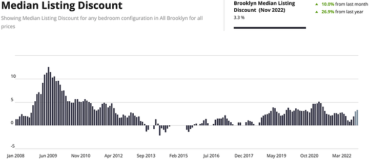 Sanguine demand following the pandemic quickly pulled the median listing discount towards zero; however, that number is on the rise again. This is surprising given that demand for Brooklyn remains quite strong, roughly 2x the historical average.