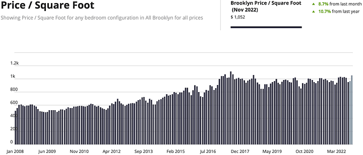 About its pre-pandemic average (the period Jan 5, 2015 — Mar 1, 2020), Brooklyn’s residential real estate market is hot. White hot. Despite lofty mortgage rates, demand for the borough is nearly 2x that pre-pandemic average, and November’s price per square foot (although not yet final as data continues to post) is approaching the all-time high reached in 2017.