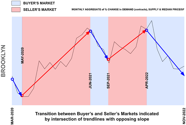 Elegran’s Leverage Indicator informs us whether the current is a buyer’s or a seller’s market, i.e, which party possesses transactional leverage. Looking at the graph below, this is indicated by the direction of the trendlines. Our indicator also informs us regarding the relative strength of that leverage, indicated by the slope of the trendlines. Per below, Brooklyn is in the grips of a strong buyer’s market.