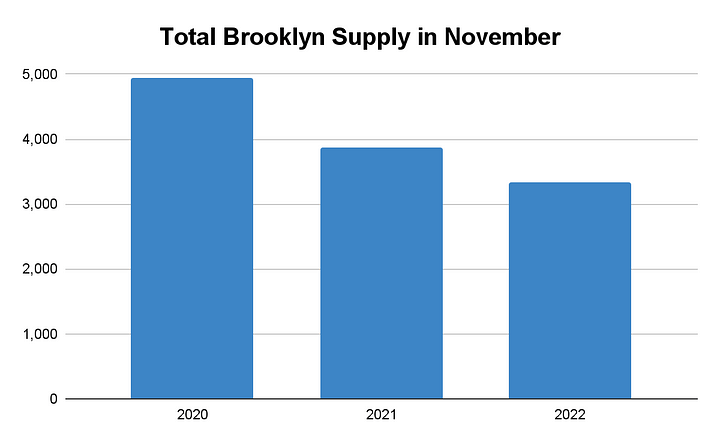 Per the first chart below, demand for Brooklyn in November appears quite anemic compared to the two previous years. However, as we’ve discussed, 2020 and 2021 were atypical. Therefore, we’ve included an additional chart to illustrate that demand for Brooklyn, as compared to the pre-pandemic average, has been incredible. Currently, demand for Brooklyn is 2x that average, despite mortgage rates.