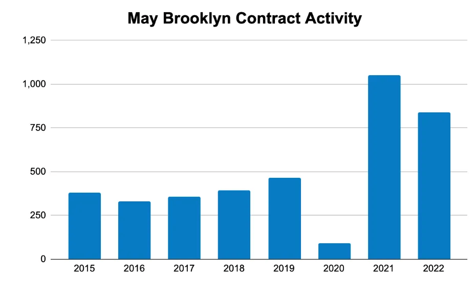 May wraps up the busy spring season for Brooklyn Real Estate as Memorial Day marks the unofficial start of summer. March, April, and May are typically the busiest months as measured by contract activity. May 2022, true to the trend, had a relatively high volume of contracts signed (839), although it is 20% lower than May 2021. Since late April, the weekly contract signed volume in 2022 began falling behind those levels in 2021 by double digits on a percentage basis. This is not surprising, given the off-the-charts and unsustainably high contract volume the market experienced last spring. With rising interest rates, some buyers accelerated plans to purchase, driving up demand now, one reason why homes have sold in nearly two months with a median which is almost 30% quicker than last spring. Brooklyn has seen steady demand for the last two years, and this summer could present a window of opportunity for buyers in the inventory-starved Brooklyn market.