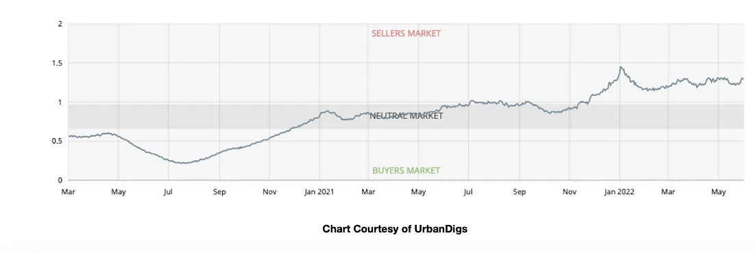 The Market Pulse [a ratio between pending sales and supply] is an indicator of leverage between buyers and sellers. A Market Pulse below 0.4 is considered a buyer’s market, a Market Pulse between 0.4 and 0.6 is considered a neutral market, and a Market Pulse above 0.6 is considered a seller’s market.