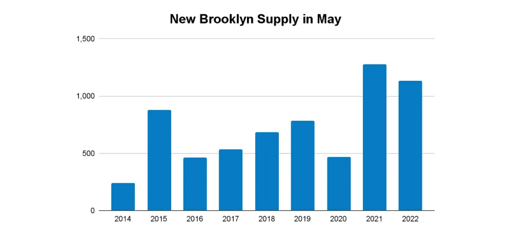 Increased by 3.5% compared to April, bringing the total supply to 2,667 units for sale. In May, 1,135 new listings came to market, 3% less than in April and 11% less than last May. Despite the decrease compared to last year, new-to-market supply remains historically very high, which is partly a reflection of the recent building boom in Brooklyn increasing the overall housing stock. Supply currently stands 22% lower than the same time last year.