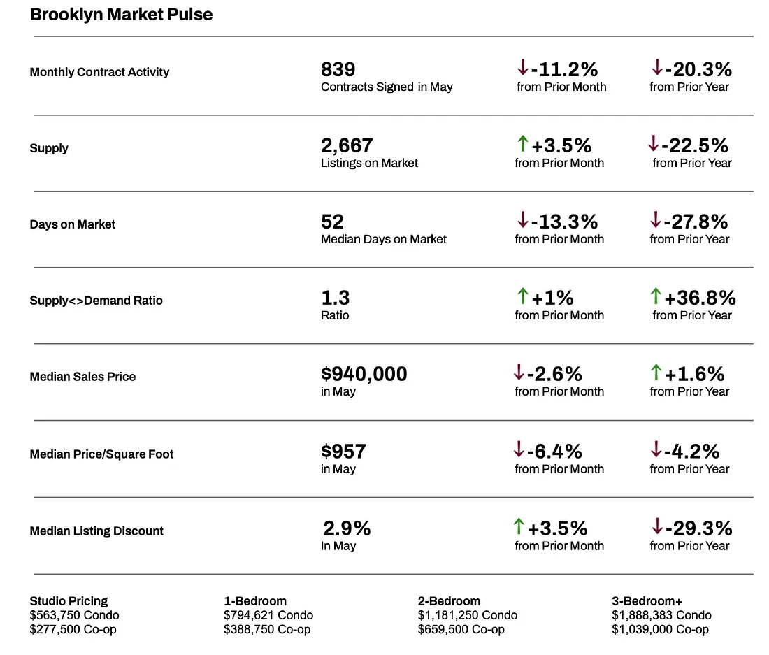 The Median Sales Price in Brooklyn decreased 2.6% from last month and increased 1.6% from last year to $940,000. On a price per square foot [PPSF] basis, the median decreased by 6.4% from last month and decreased by 4.2% from the previous year to $957. Meanwhile, the median listing discount increased from 2.8% to 2.9% in May, which is 29% lower than last year.