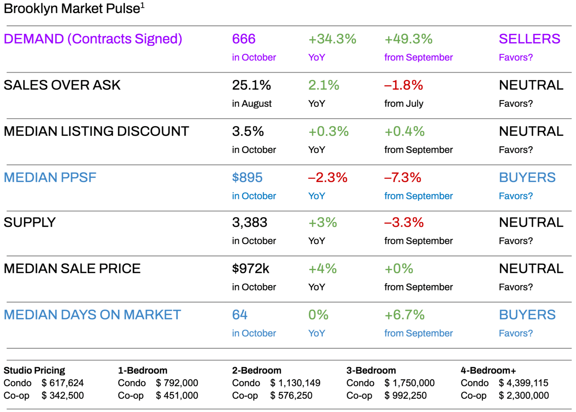 - BUYERS: The slight decline in median PPSF is a lagging indicator tied to contracts signed before the Fed’s interest rate cut. The current demand for Brooklyn real estate suggests that prices are under upward pressure.