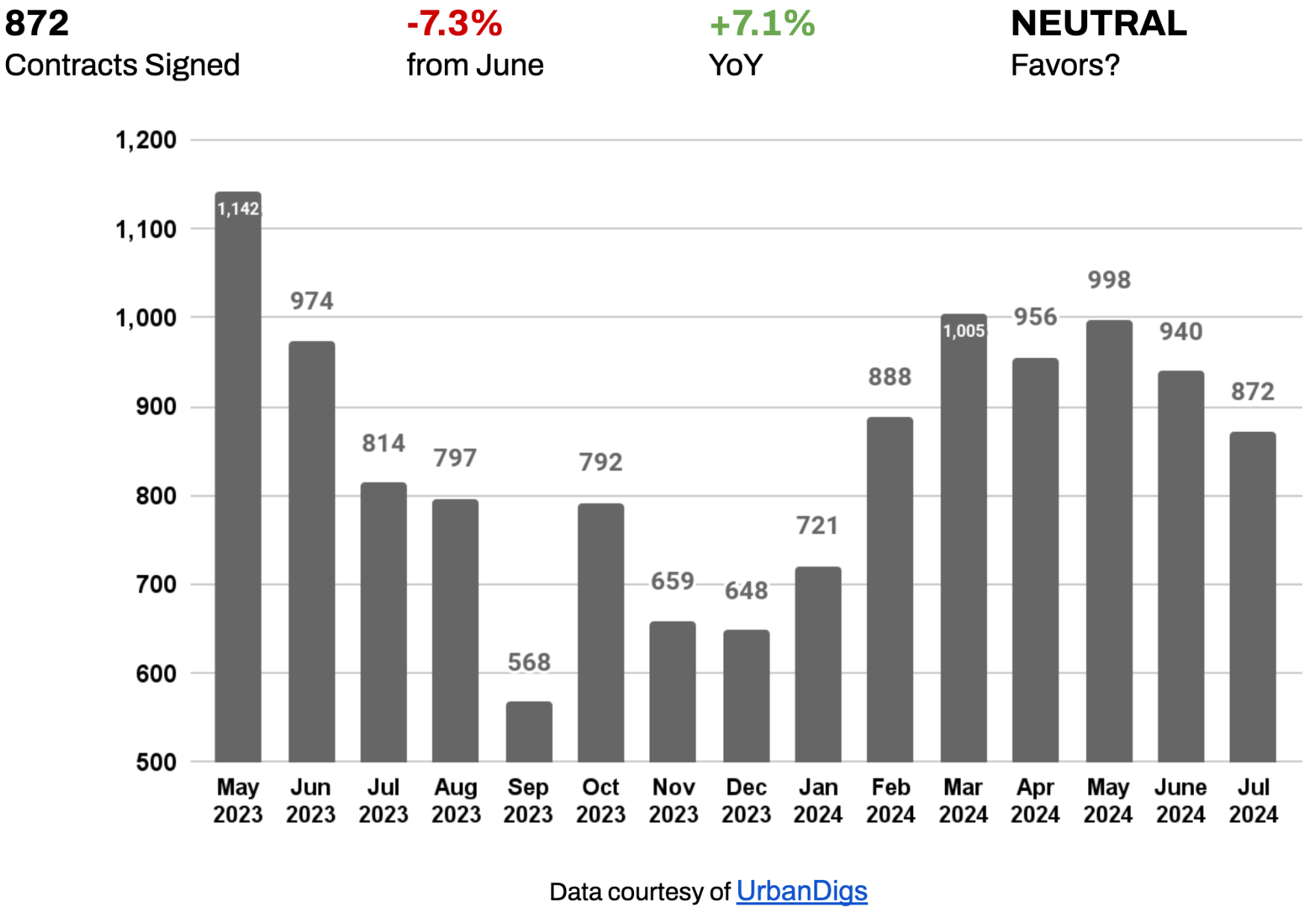- BUYERS: The 7.3% decrease in contracts signed from June to July 2024 aligns with seasonal norms, as July typically lags behind June in contract volume. However, contract volumes remained strong for July, and combined with the decline in supply, this creates a more competitive market than usual.