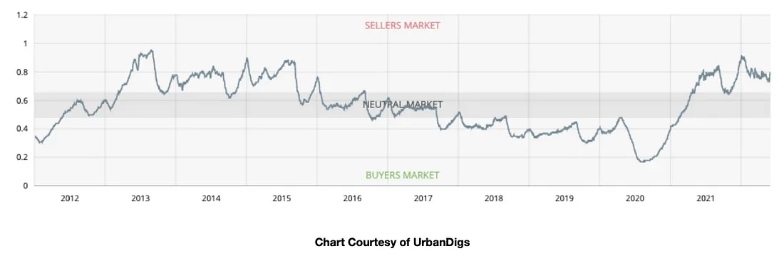A Market Pulse below 0.4 is considered a buyer’s market, a Market Pulse between 0.4 and 0.6 is considered a neutral market, and a Market Pulse above 0.6 is considered a seller’s market.] In a seller’s market, sellers often have more leverage than buyers because demand is greater than supply, resulting in apartments selling quickly, fewer discounts, and increased bidding wars.