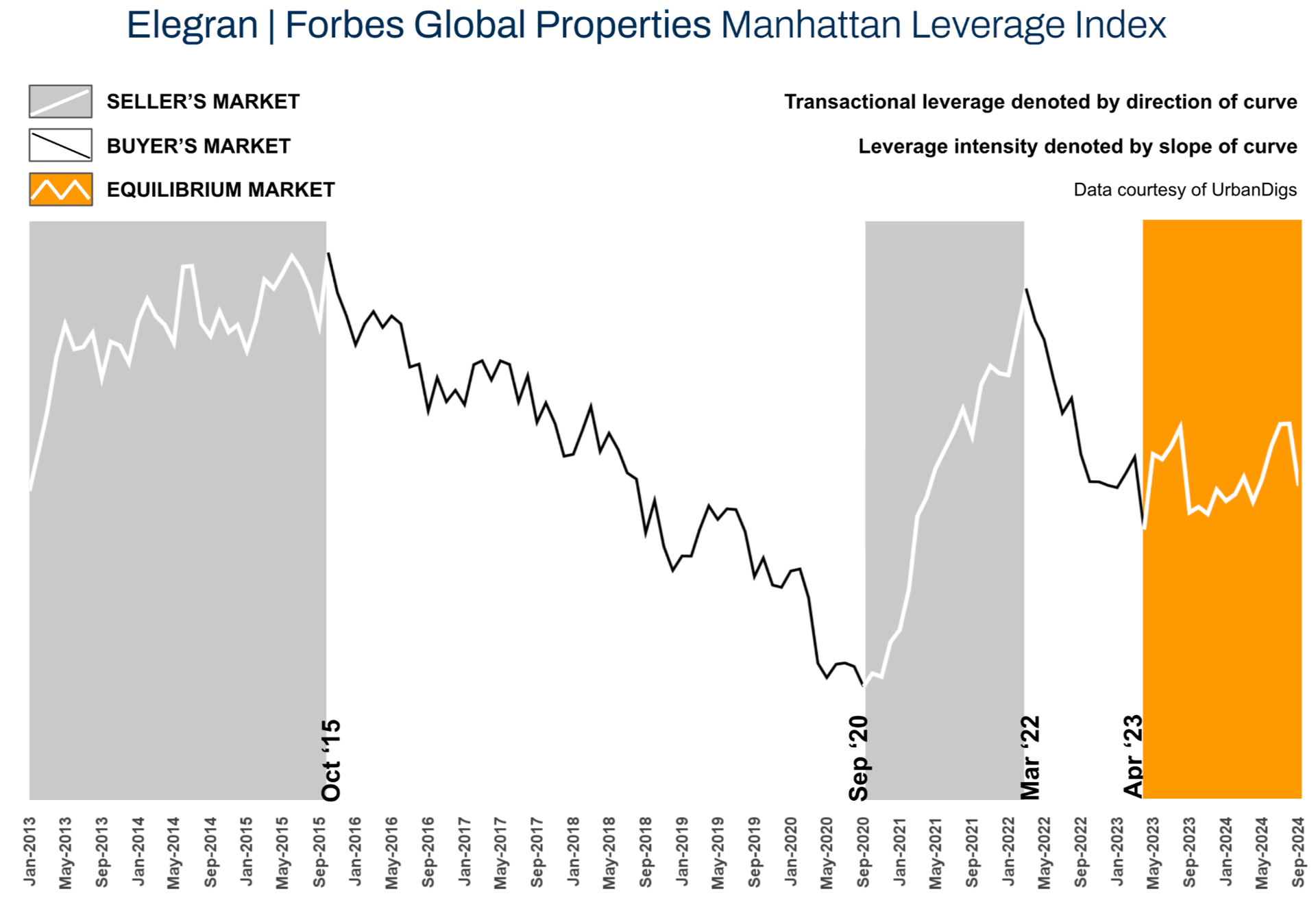 The Elegran | Forbes Global Properties Manhattan Leverage Index is powered by four indicators: supply, demand, median price per square foot (PPSF), and median listing discount.