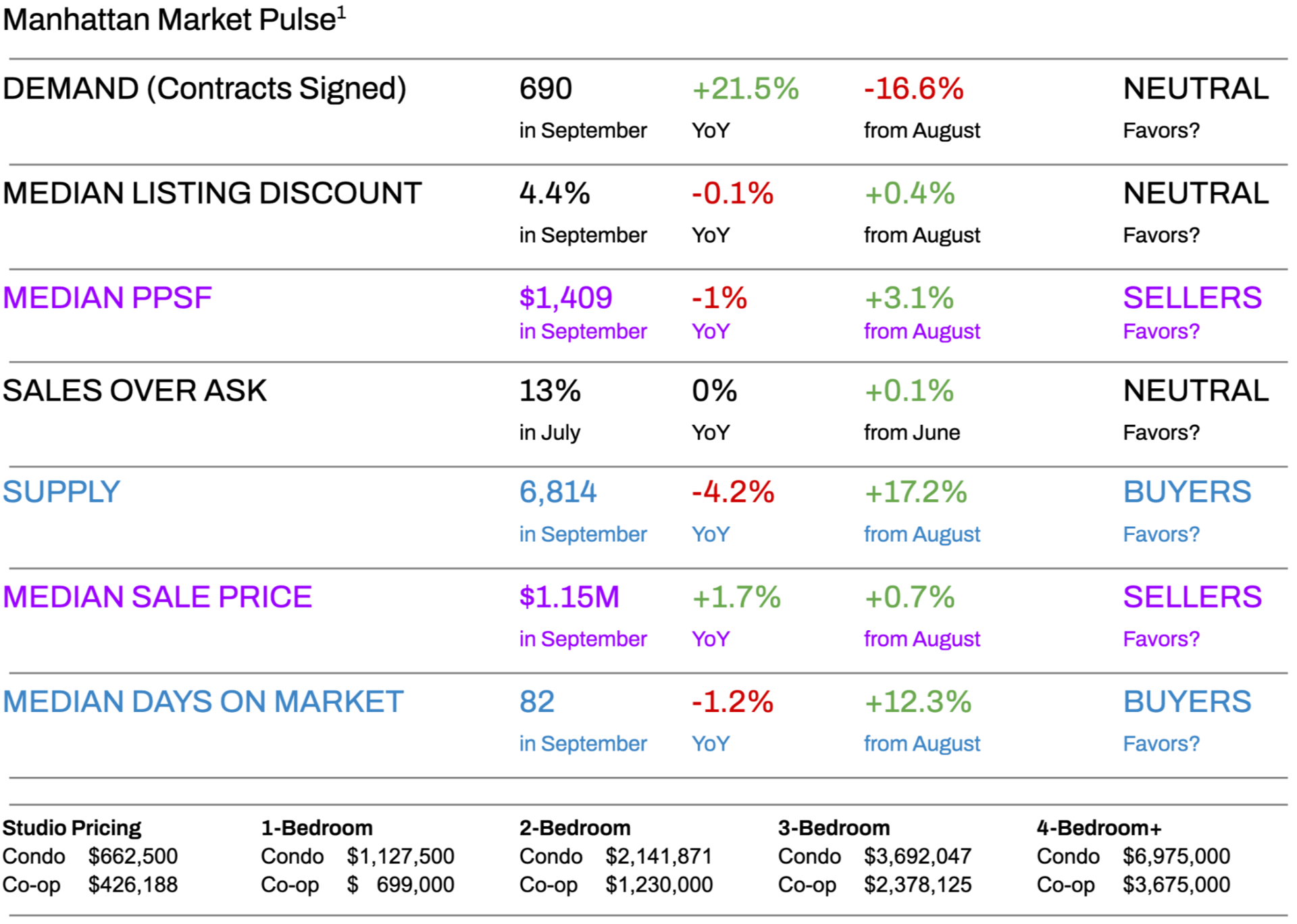 Manhattan’s housing inventory saw its usual seasonal rebound in September, with 6,814 units available—a 17.2% increase from August but, importantly, 4.2% lower year-over-year. This new supply aligns with increased buyer interest driven by lower mortgage rates, but inventory remains relatively tight compared to last year, helping to maintain market equilibrium. Buyers will find more options but should brace for increased competition, especially for well-priced properties. Sellers, meanwhile, must be strategic with pricing to capitalize on rising buyer activity and avoid extended market time.