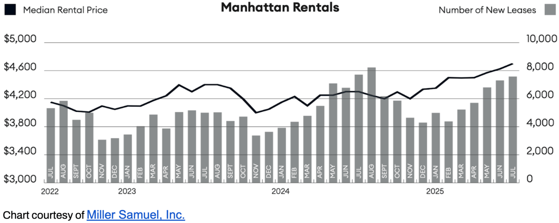According to Miller Samuel, Manhattan’s median rent reached $4,600 in August 2025 — down 2.1% month over month but still 8.4% higher than the same time last year, marking one of the highest levels on record.³ By August, most of the FARE Act adjustment was baked in, and the slight improvement in inventory (plus perhaps some renter fatigue at sky-high prices) meant rents couldn’t climb much further.