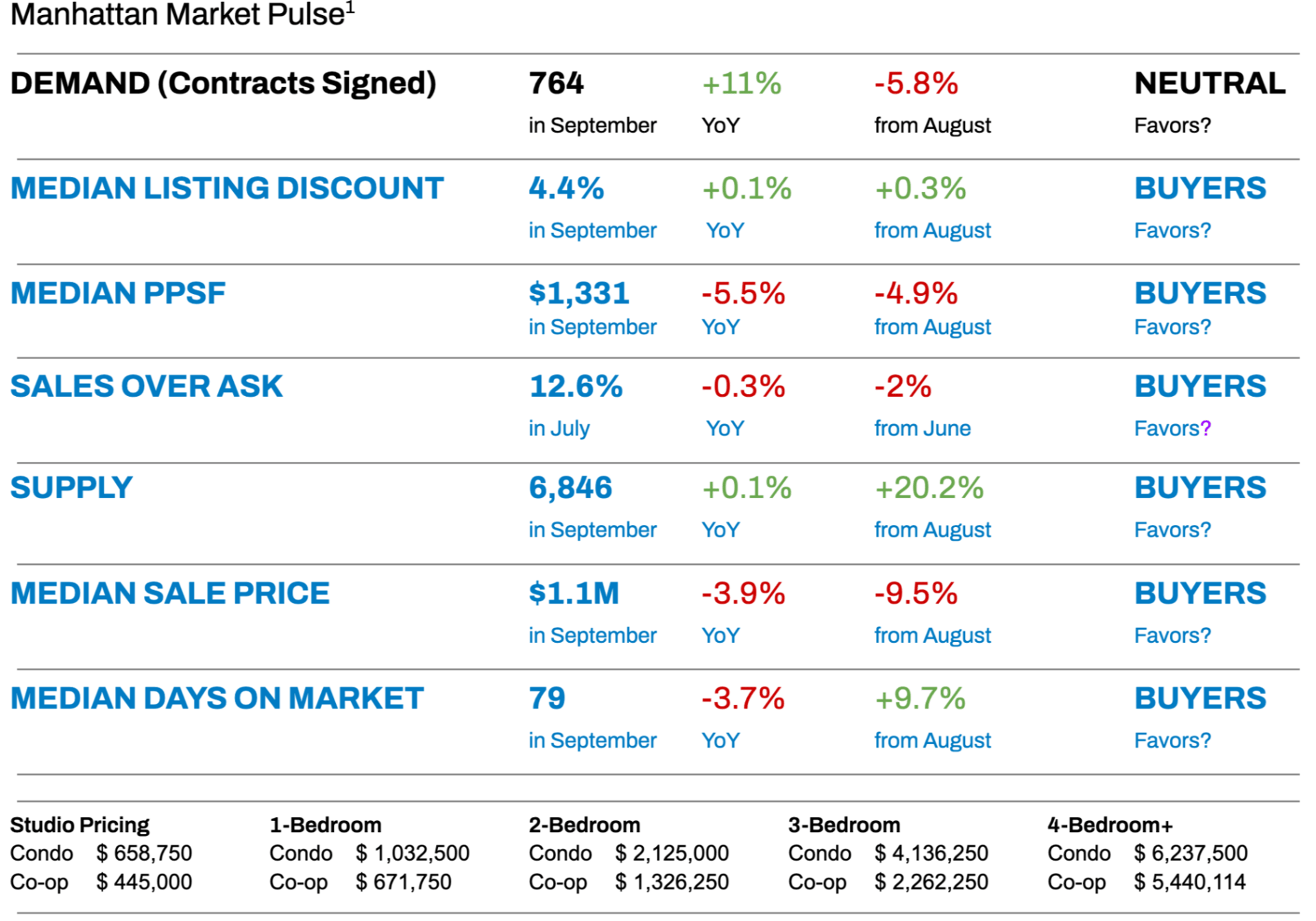 BUYERS: The slight drop in PPSF is encouraging if you’ve been frustrated by high prices – it means the market is bending in your favor on pricing, albeit gradually. But remember, Manhattan is still an ultra-competitive, low-supply market in many segments; we’re talking modest price relief, not bargains galore. Your best opportunity to capitalize on the price softening is to identify listings with motivated sellers – perhaps those that didn’t move over the summer or new listings priced on the aggressive side that haven’t found traction.