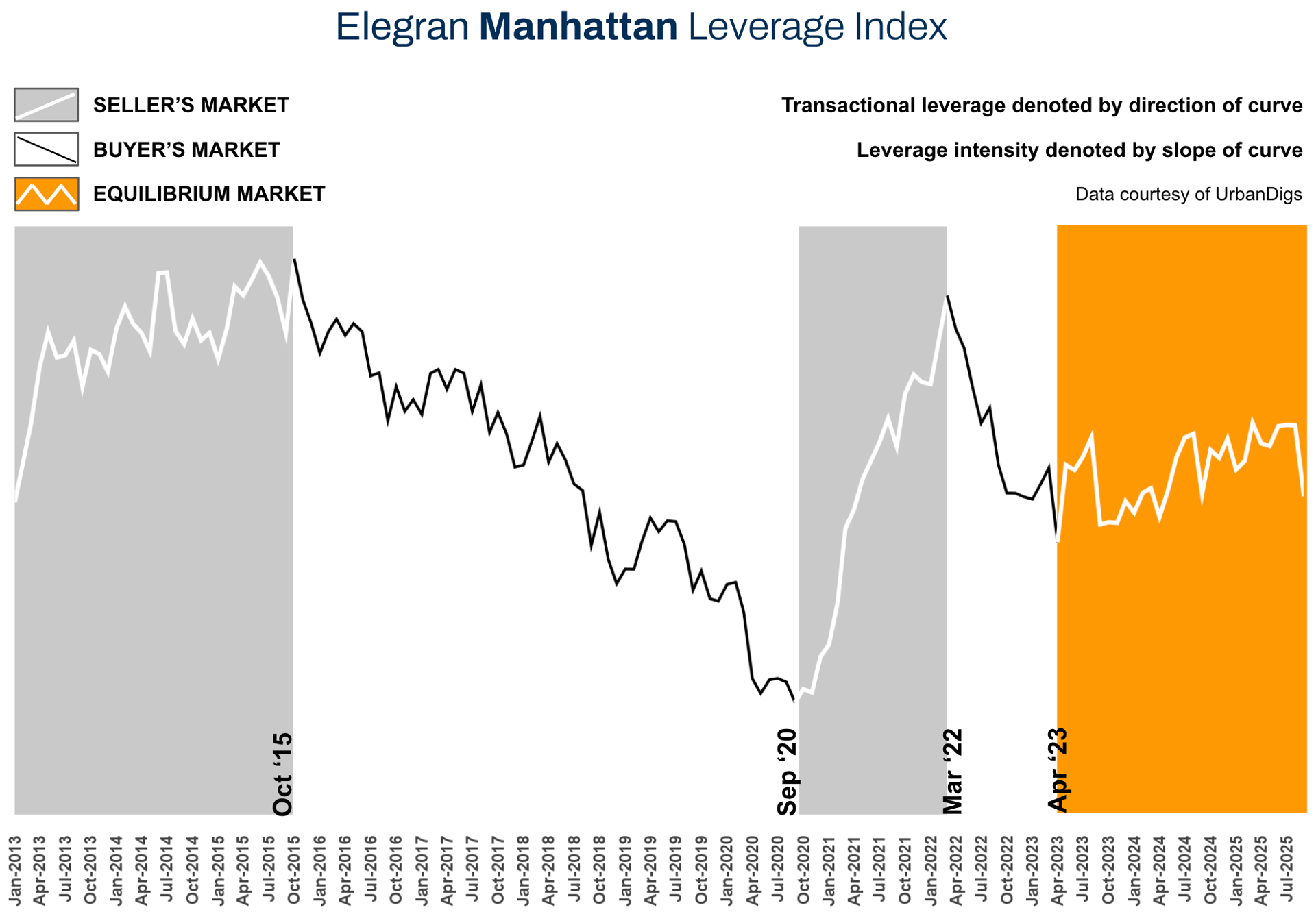 The Elegran Manhattan Leverage Index² blends four market signals - supply, demand, median price per square foot, and median listing discount - to capture the balance of power between buyers and sellers.