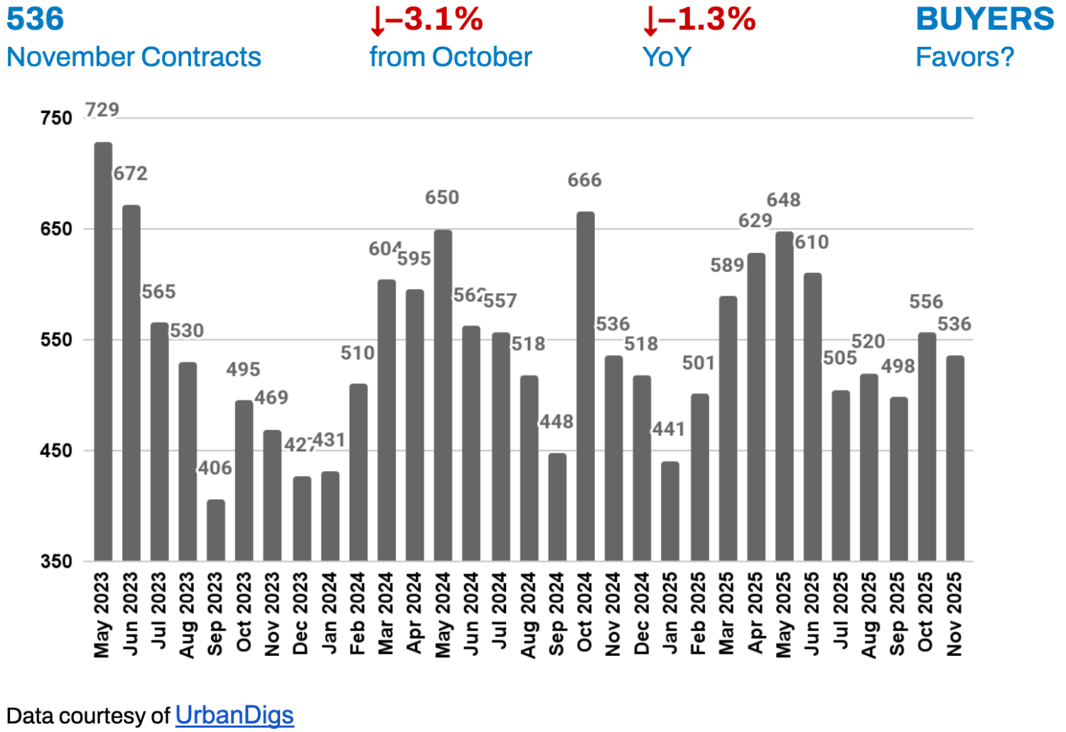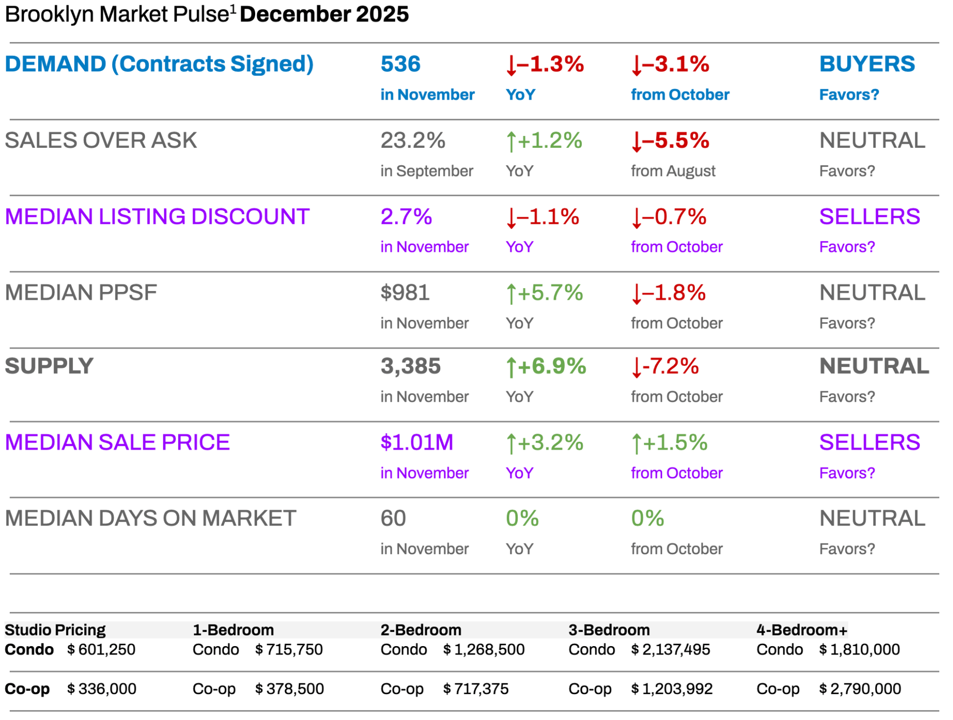 Mild Seasonal Slowdown: Brooklyn experienced only a modest holiday lull. Contract signings in November were nearly flat from October, declining just ~1%, which is a far gentler drop than the typical year-end cooldown. Buyer engagement remained resilient even as the winter season began.