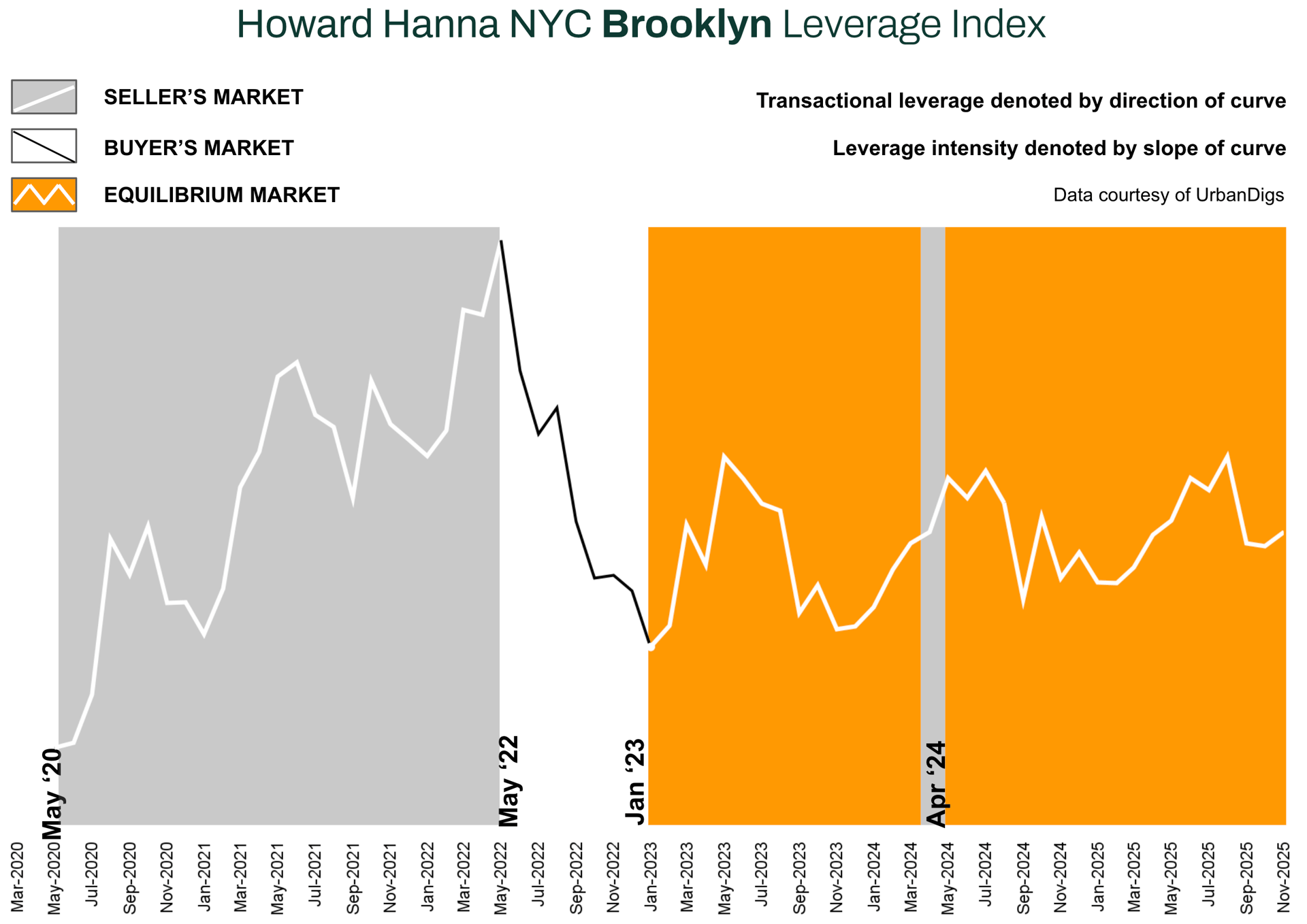 This gave buyers a bit more choice than a year ago, though not enough to tip the scales. Overall, conditions stayed balanced with a modest edge for sellers: the Howard Hanna NYC Brooklyn Leverage Index² for November was broadly neutral, indicating no overwhelming advantage for either side but a slight tilt in sellers’ favor.
