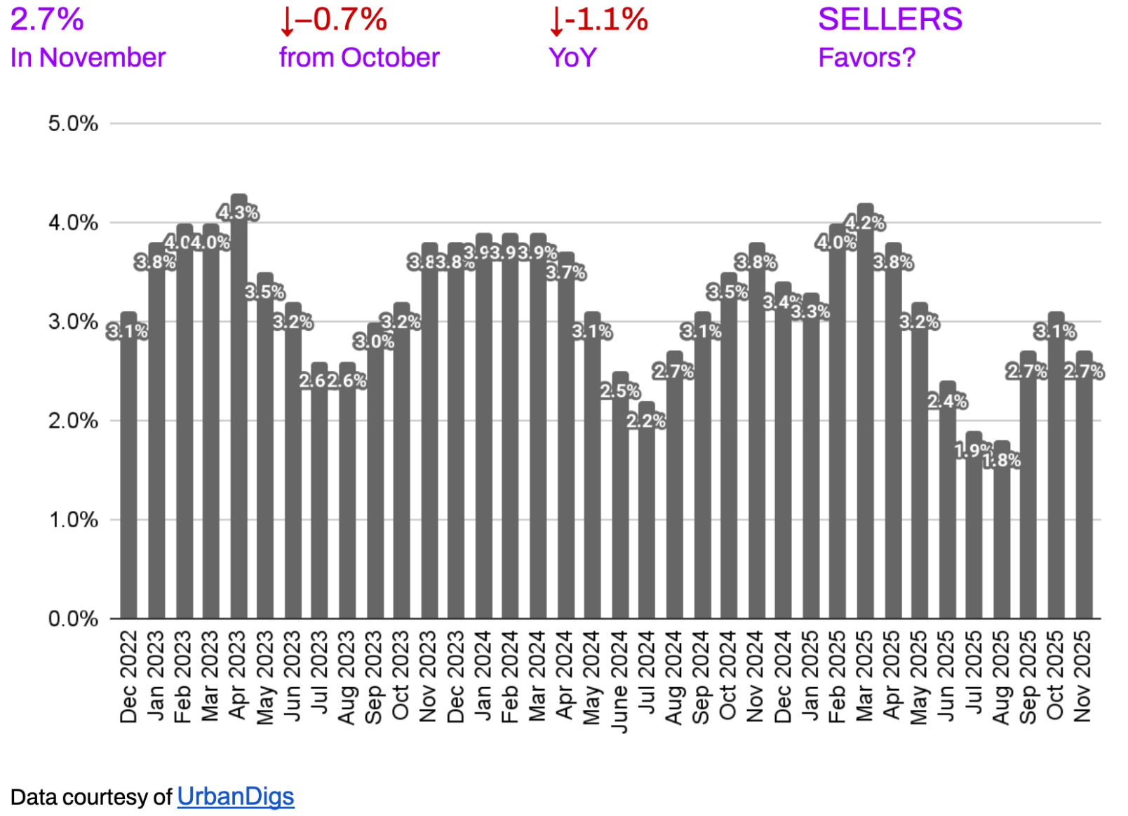 Buyers gained some relief from higher inventory compared to last year, but not enough to flip negotiating power entirely. Sellers still benefited from firm pricing and low discounts, giving them a subtle edge as the year ended.