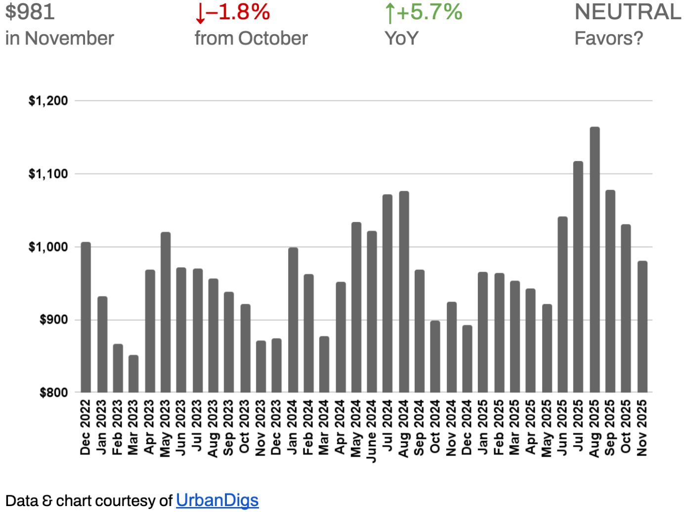 Brooklyn’s median price per square foot (PPSF) for closed sales in November was $981. This figure pulled back about 1.8% from October, when PPSF hit a record high for the year. In other words, prices per square foot cooled just a touch as the market transitioned into winter. Importantly, however, PPSF remains 5.7% higher than it was a year ago – a substantial annual gain that underscores how much Brooklyn values climbed during 2025. Even with the late-year breather, Brooklyn’s pricing has shown notable resilience. The slight month-to-month dip likely reflects a shift in the mix of sales (fewer high-priced deals closing post-summer) and a natural stabilization after a vigorous run-up. By and large, sellers held firm on pricing and buyers were willing to pay near 2025’s elevated levels.