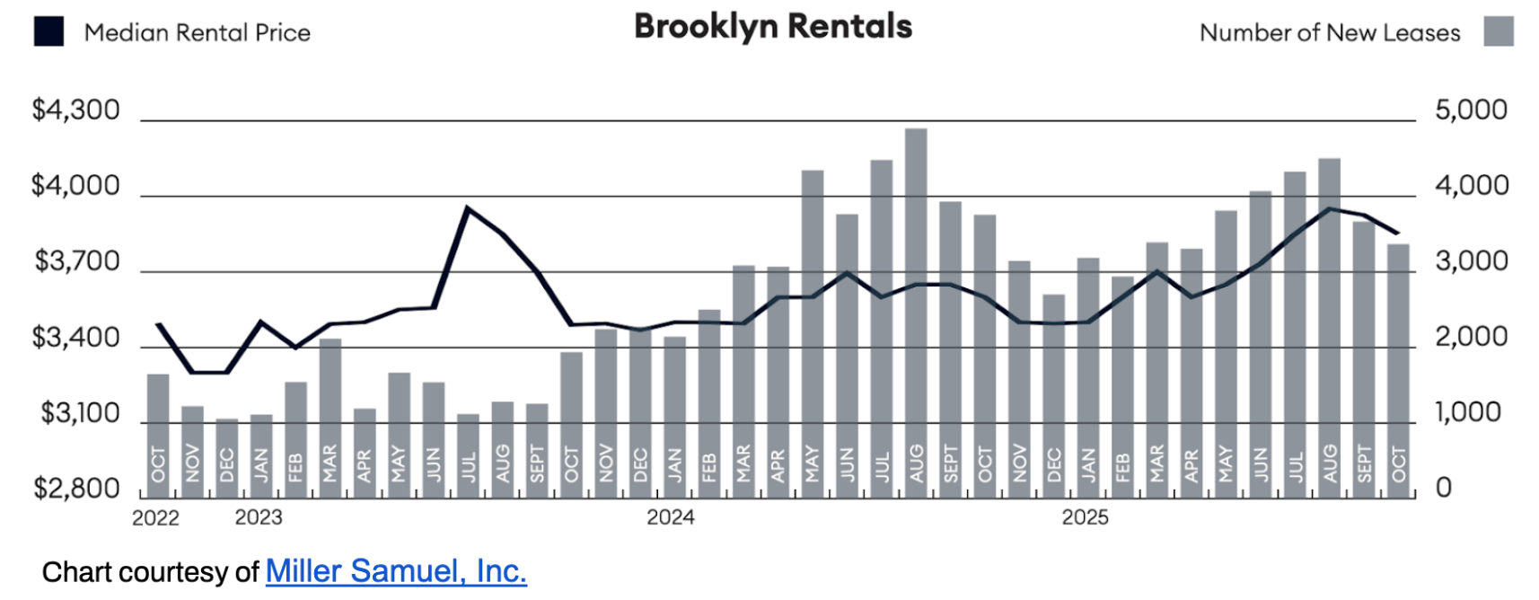 Brooklyn’s rental market remained historically tight in October, with median rent at $3,850 – down 1.9% from September, yet still 6.9% higher than a year ago, marking the third-highest level on record.³ Both median and average rents climbed annually, outpacing the U.S. inflation rate of roughly 3%. Meanwhile, new lease signings fell year-over-year for the fourth consecutive month, reflecting affordability constraints and lease renewals by tenants reluctant to re-enter a competitive market.