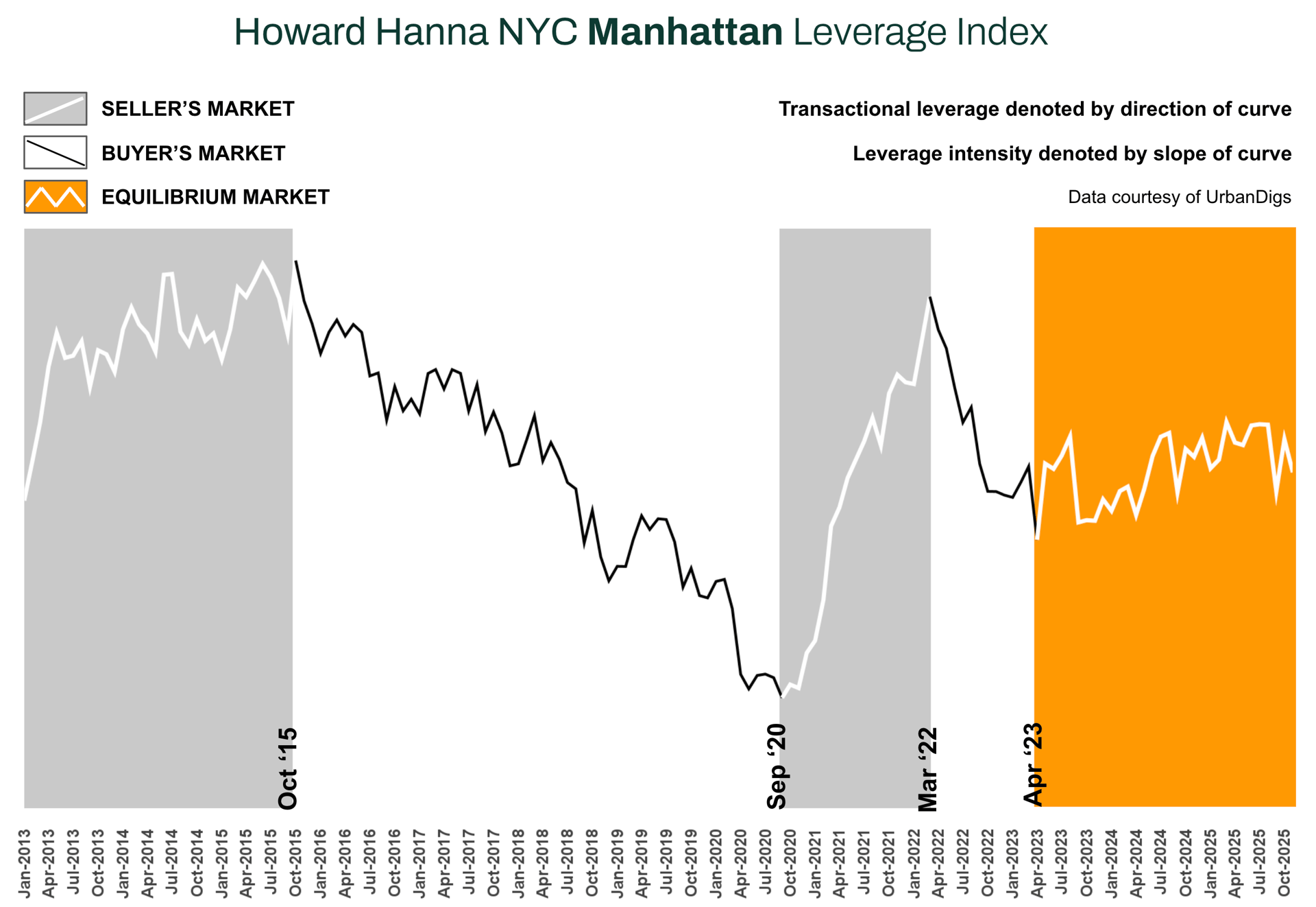 The Howard Hanna NYC Manhattan Leverage Index blends four market signals - supply, demand, median price per square foot, and median listing discount - to capture the balance of power between buyers and sellers.