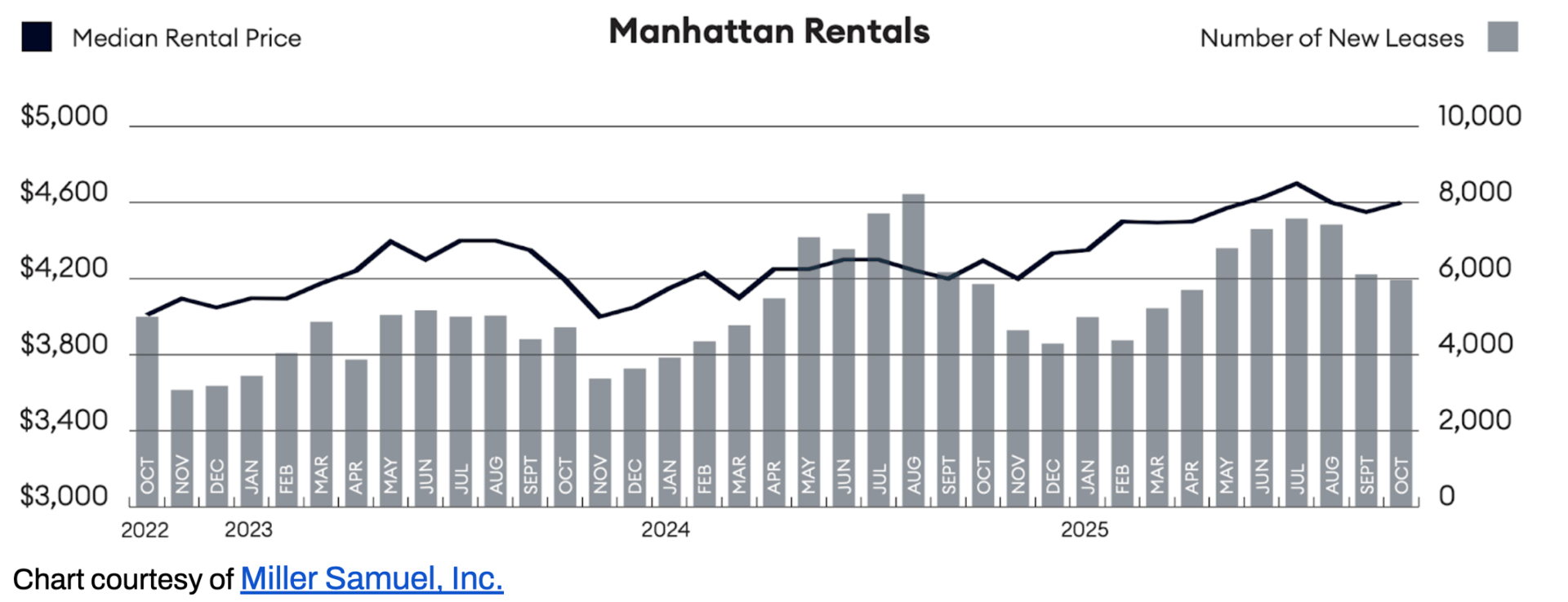 Median rent rose to $4,600 (↑1.1% MoM, ↑7.1% YoY)³ - the third-highest on record. New lease signings edged up modestly, while vacancy declined for the seventh straight month. All of this points to continued landlord leverage – there are far more renters looking than there are apartments available. In fact, bidding wars haven’t disappeared: roughly 1 in 5 rental listings is still renting for above the asking price, even as we head into winter