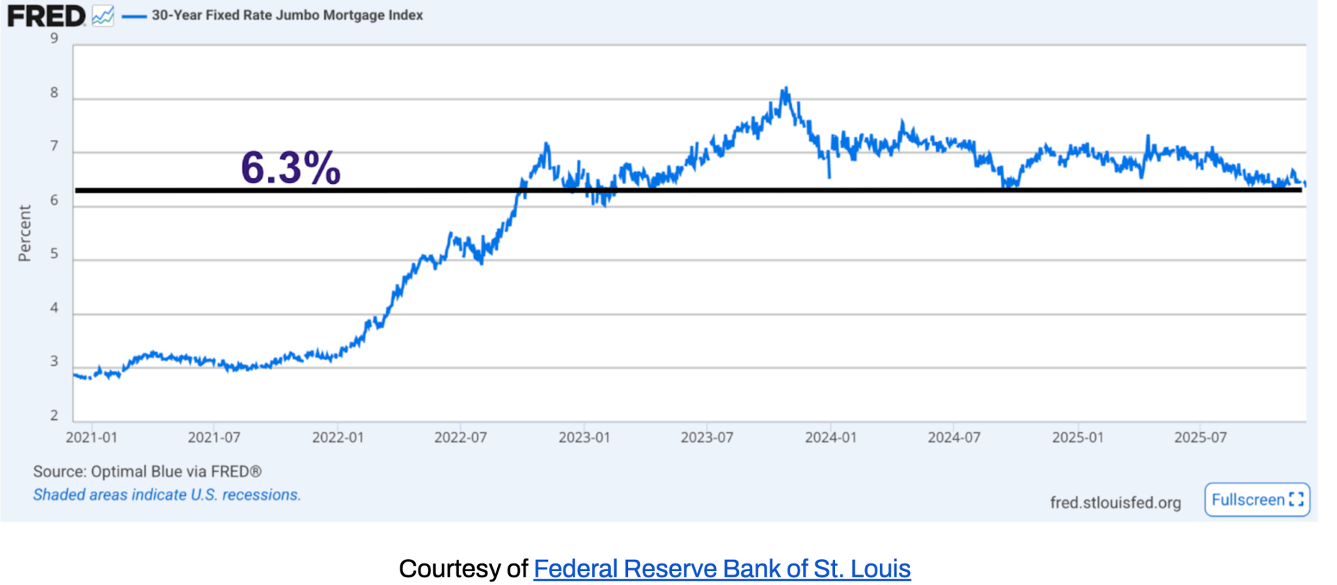 Rates remain elevated but are drifting lower. December jumbo loans average ~6.3%⁴, down from Q3’s 7%+ peak. The jumbo APR settled near 6.1⁵ percent in November. The “rate lock” effect persists, keeping many would-be sellers off-market. Buyer demand is weakening as affordability pressures mount, driven by elevated prices, higher mortgage rates, and softer immigration flows. These dynamics are slowing transaction activity, yet tight inventory continues to keep prices elevated.