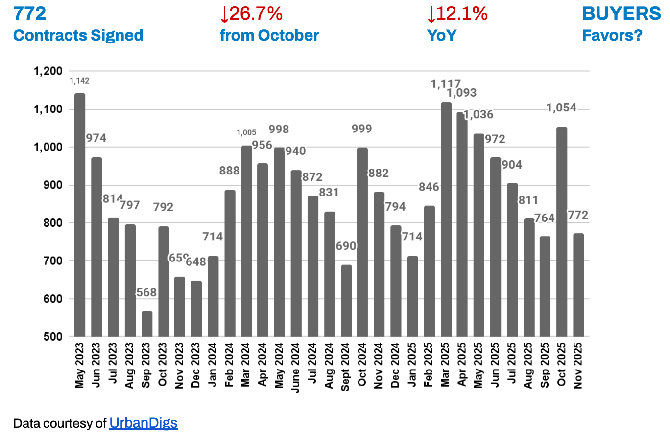 In November, the index ticked downward into neutral territory, indicating no clear advantage for buyers or sellers. This was a pivot from October (which had tilted in sellers’ favor) and reflects the market’s year-end equilibrium. Of the four index components, contract activity pulled back