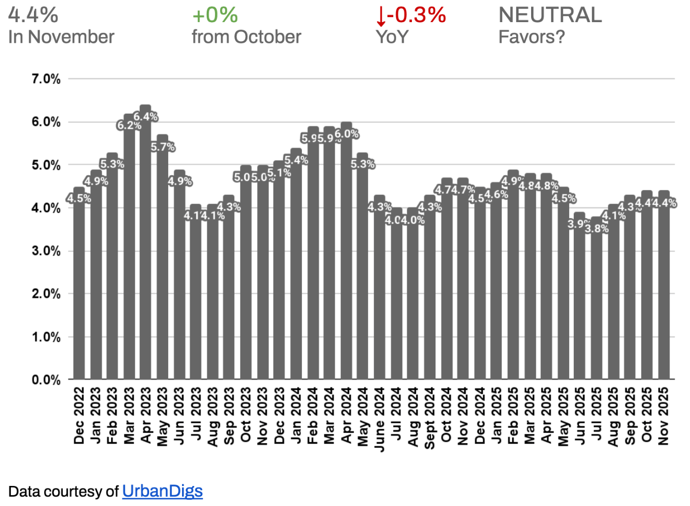 Supply and discounts lingered around neutral. In effect, the autumn surge in demand dissipated, tempering seller leverage, even as low inventory continued to prevent any buyer’s market. The outcome is a balanced standoff: neither side had a decisive edge as the holiday season set in.