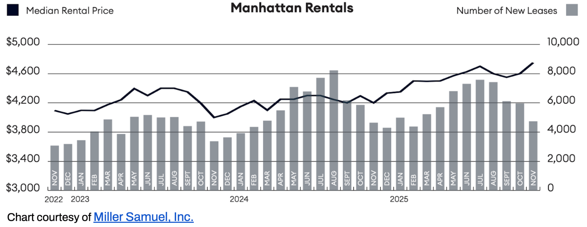 Manhattan’s rental market finished 2025 at all-time highs. The median monthly rent in December climbed to approximately $4,750 – up +3.3% from November and a staggering +13.1% year-over-year – marking a record high for Manhattan.³