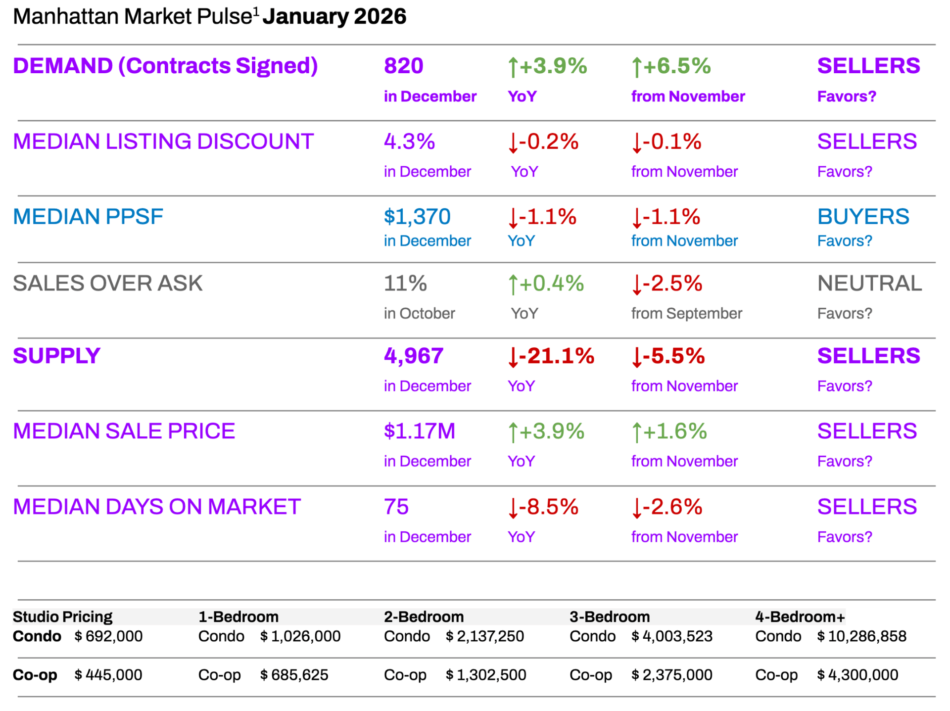 Outlook: Overall, Manhattan begins 2026 in a position of balance with a slight seller tilt. Demand is resilient, inventory remains constrained, and pricing is broadly stable, supporting a disciplined and measured market environment as the year unfolds.