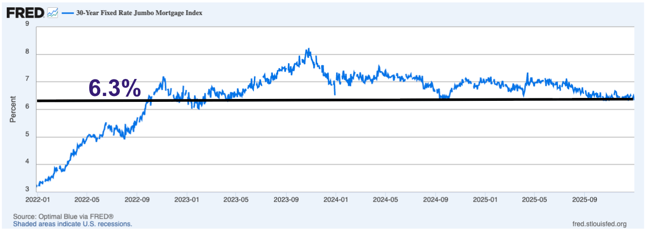 Mortgage rates remain elevated but are drifting lower compared to their 2025 peak. By December, the average 30-year jumbo loan rate hovered around 6.3%⁴, down from the 7%+ highs seen in Q3. Many borrowers with excellent credit even saw quotes in the high-5% range for conforming loans toward year-end. The APR for jumbo loans (which factors in some fees) settled near 6.1%⁵ in December.