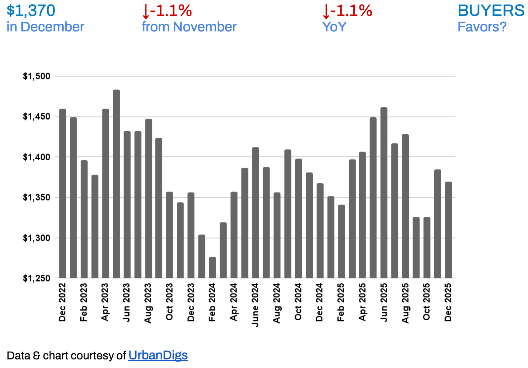 Price indicators, however, remain mixed. The median sale price rose to $1.17 million, up 3.9% year over year and 1.6% from November, while the median price per square foot (PPSF) eased to $1,370, down 1.1% on both a monthly and annual basis. Transaction dynamics suggest stability rather than excess: the median listing discount held at 4.3%, meaning homes traded at approximately 96% of asking price, and median days on market declined to 75, roughly 8% faster than a year ago. Well-priced listings continue to transact efficiently.