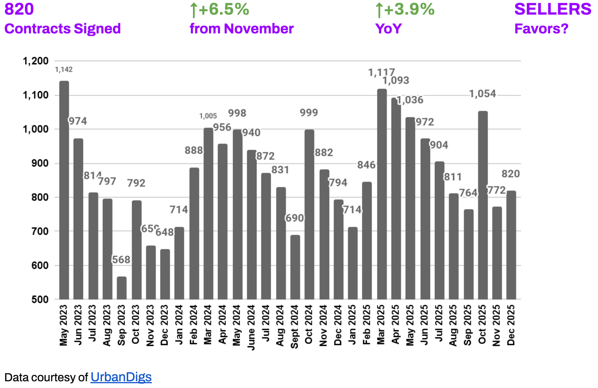 Manhattan’s residential market closed 2025 with renewed momentum, setting a constructive backdrop for the start of 2026. Contract activity increased to 820 signed deals in December, up 6.5% month over month and 3.9% year over year, signaling a return of buyer engagement following the seasonal November slowdown. At the same time, active inventory declined to 4,967 listings, representing a 5.5% monthly drop and a 21.1% year-over-year contraction, leaving supply near recent cyclical lows.
