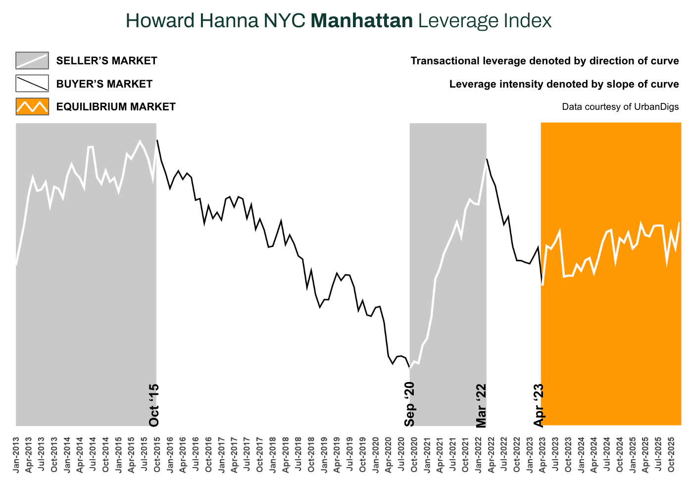 Against this backdrop of strengthening demand and constrained inventory, the Howard Hanna NYC Leverage Index shifted back into seller territory, indicating a modest but clear advantage for sellers entering the new year.