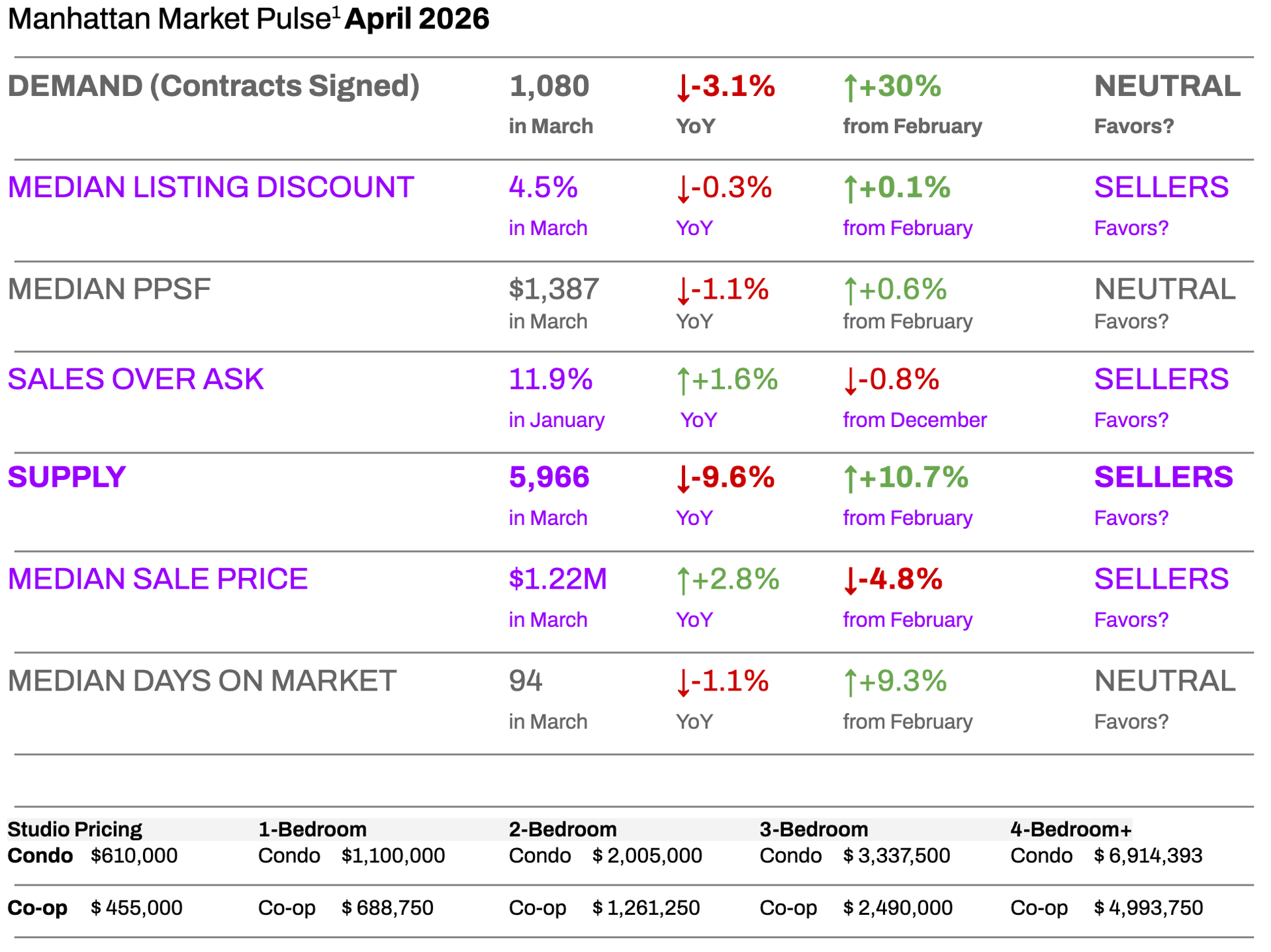 🟦 Buyers: Broad price declines are not supported by current supply-demand dynamics. Value is asset-specific — co-ops continue to offer meaningful price-per-square-foot advantages over condos in comparable locations.