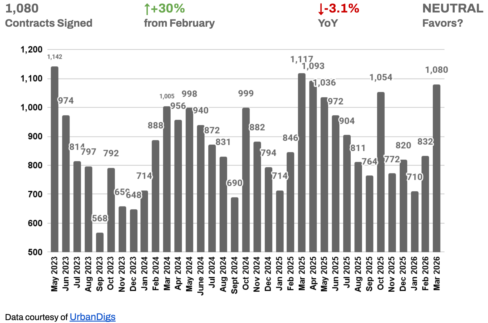 March brought 1,080 signed contracts — a 30% jump from February and a clear confirmation that buyers are returning to the market in force. The month-over-month acceleration is the strongest signal of the spring so far, reflecting pent-up demand that had been building through a quieter January and February.