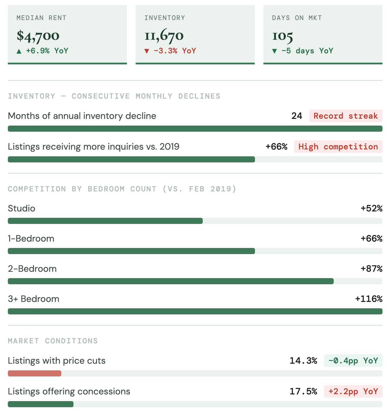 Manhattan's rental market entered 2026 at record levels. The February median asking rent rose 6.9% year-over-year to $4,700 - a record high. Inventory fell 3.3% to 11,670 units, marking the borough's 24th consecutive month of annual declines, the longest streak ever recorded.³