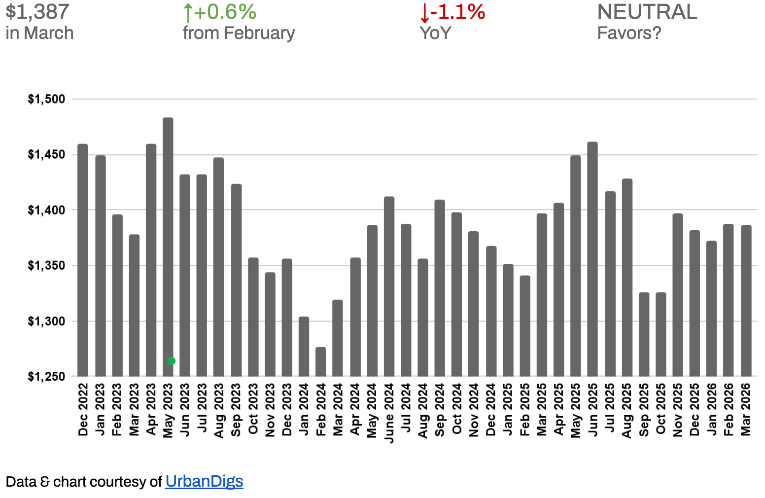 5,966 active listings — up from February, but still 9.6% below this time last year. Supply is rising, but structurally constrained.