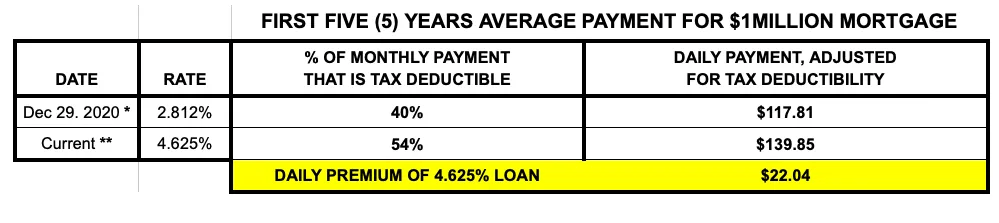 In the table above, we’ve compared the average payment over the first five (5) years of two $1MILLION JUMBO rate mortgages (30-year fixed payment), one from the historically low level reached on Dec 29, 2020,1 (2.812%) and another currently offered by Wells Fargo2 (4.625%).