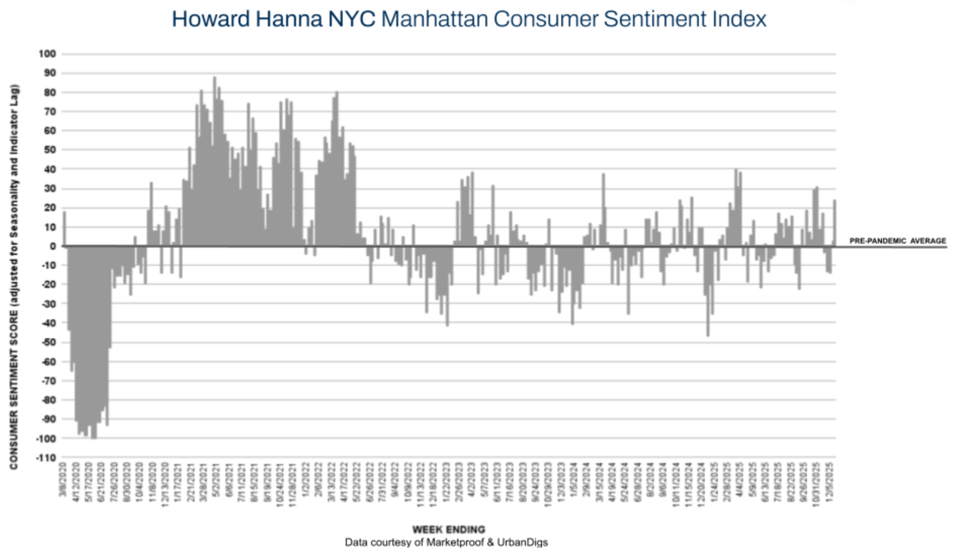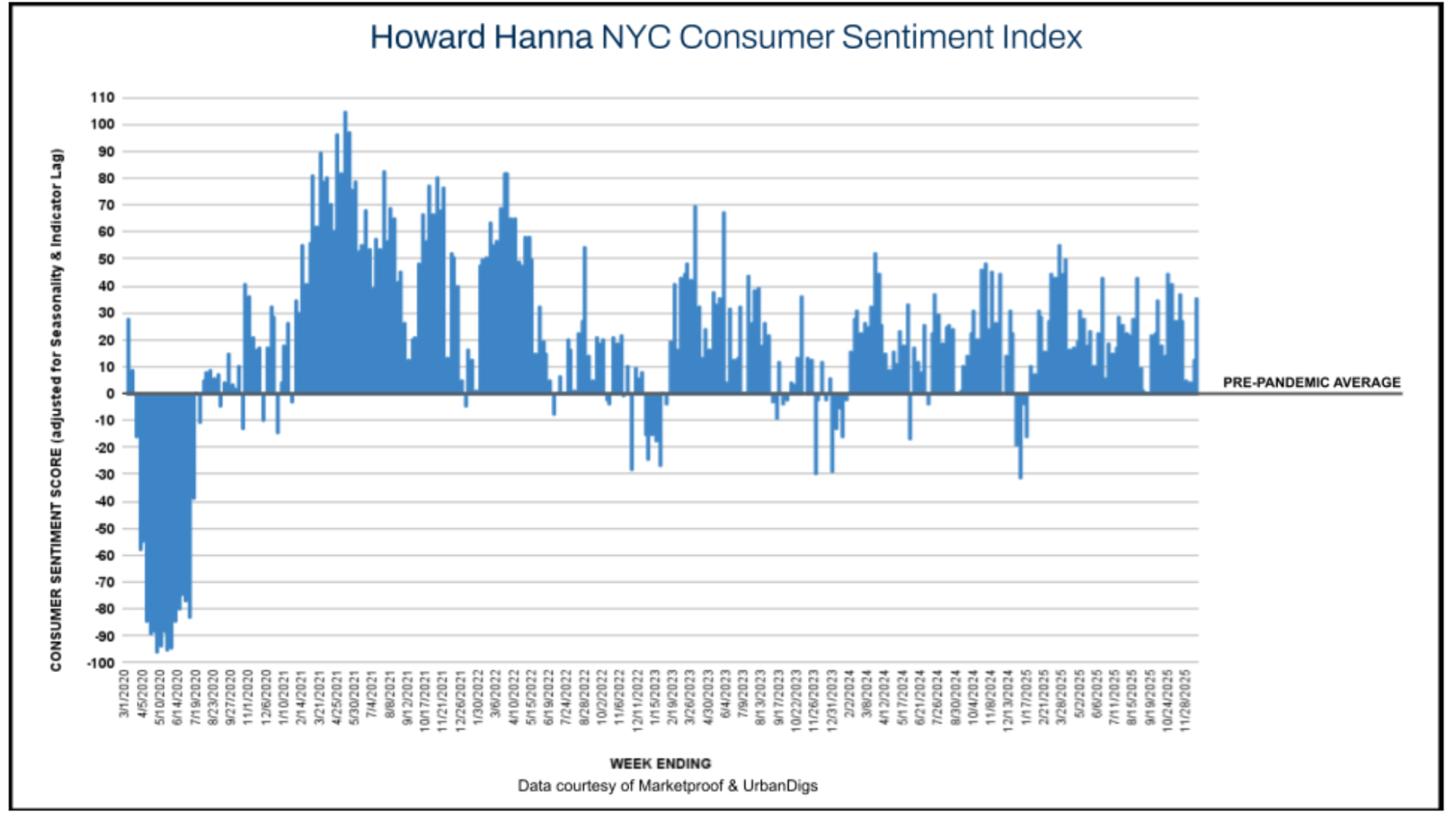 The final full reporting week of 2025 delivered a notable late-season push across both Manhattan and Brooklyn. While inventory continued to contract sharply as sellers stepped back for the holidays, buyer activity accelerated, driving meaningful gains in pending sales and signed contracts. Manhattan posted a particularly strong surge in consumer sentiment, while Brooklyn closed the year with resilient momentum and broad-based demand. Reflecting this shift, the Howard Hanna NYC Consumer Sentiment Index increased from +13% to +36%, signaling a strong year-end release of pent-up demand ahead of the January reset.