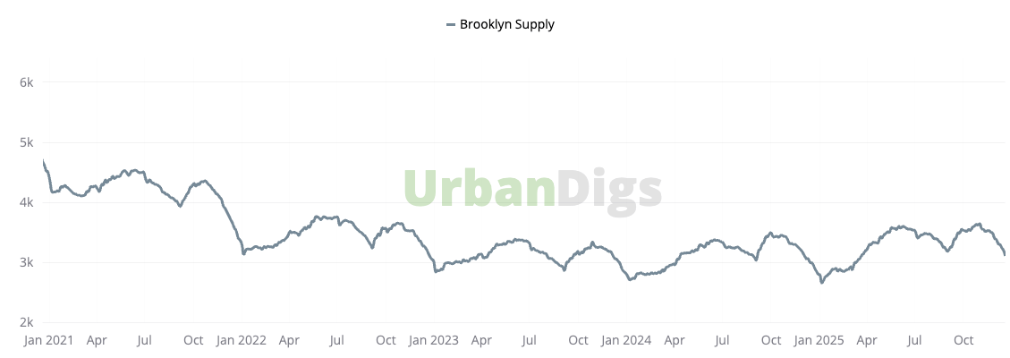 Brooklyn supply decreased to 3,118 homes (–4.4% WoW, +4.6% YoY), marking its seventh straight weekly decline. New listings fell to 82 units (–33% WoW, –19% YoY), reversing last week’s brief uptick and confirming that most sellers have effectively closed out 2025.