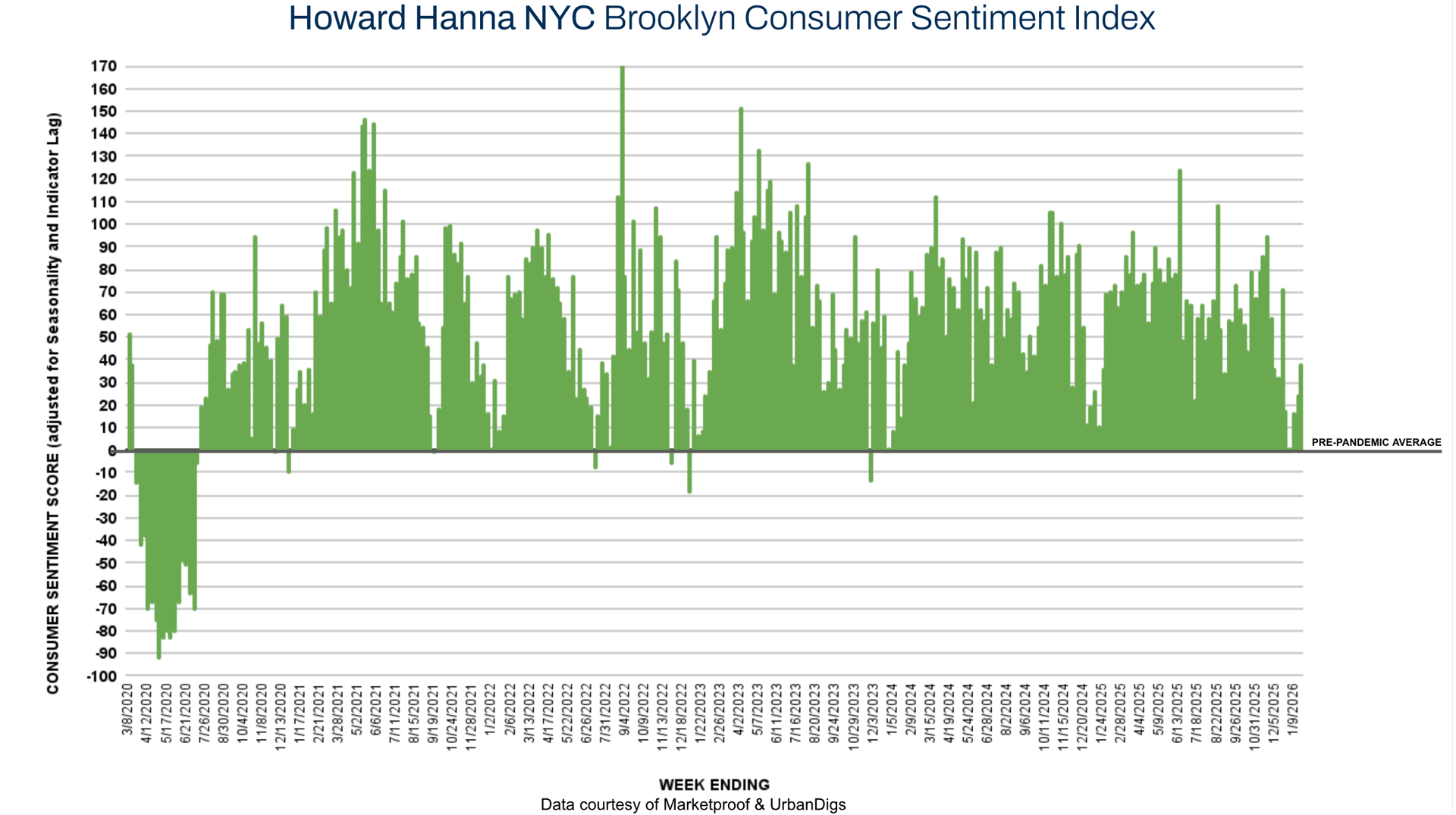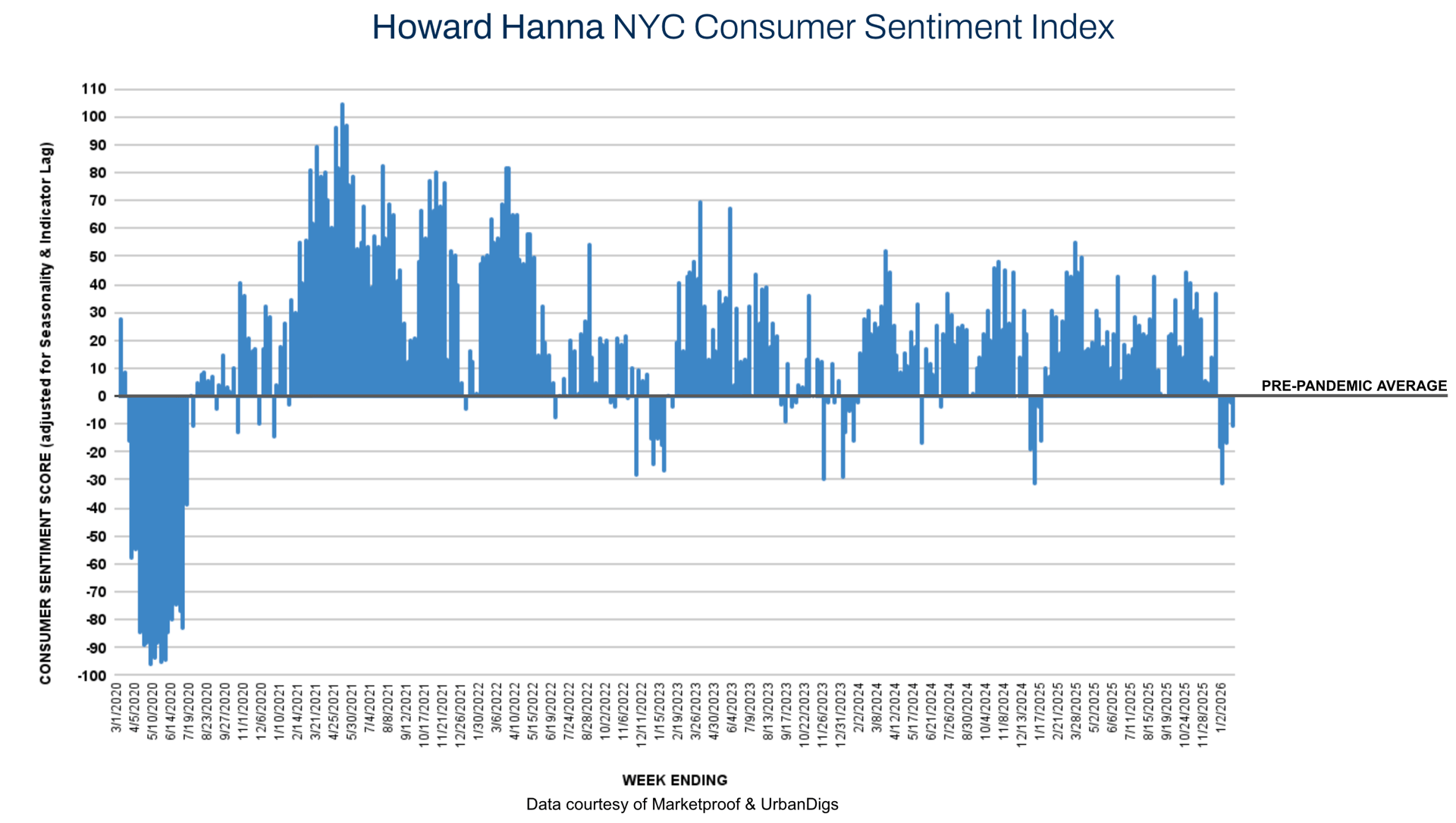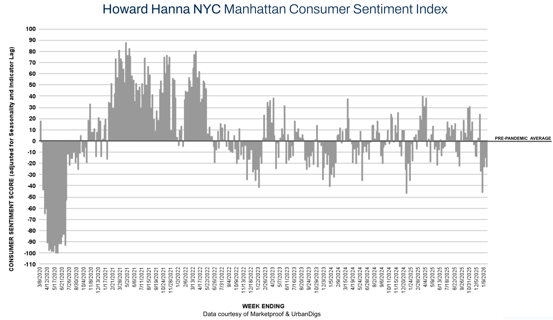 The Howard Hanna NYC Consumer Sentiment Index improved meaningfully increasing from -5% to-2% this past week, signaling a gradual normalization in buyer psychology as 2026 begins. While activity remains selective, buyers are increasingly re-entering the market, particularly in well-priced, quality inventory, as expectations around rates, supply, and pricing clarity begin to stabilize.