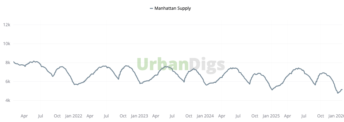 Bottom line: Early 2026 is shaping up as a market defined by selectivity, pricing discipline, and forward planning. Buyers are no longer on pause, but conviction remains highest where value and quality align.Manhattan Supply: Inventory Expands as Sellers Position for Spring