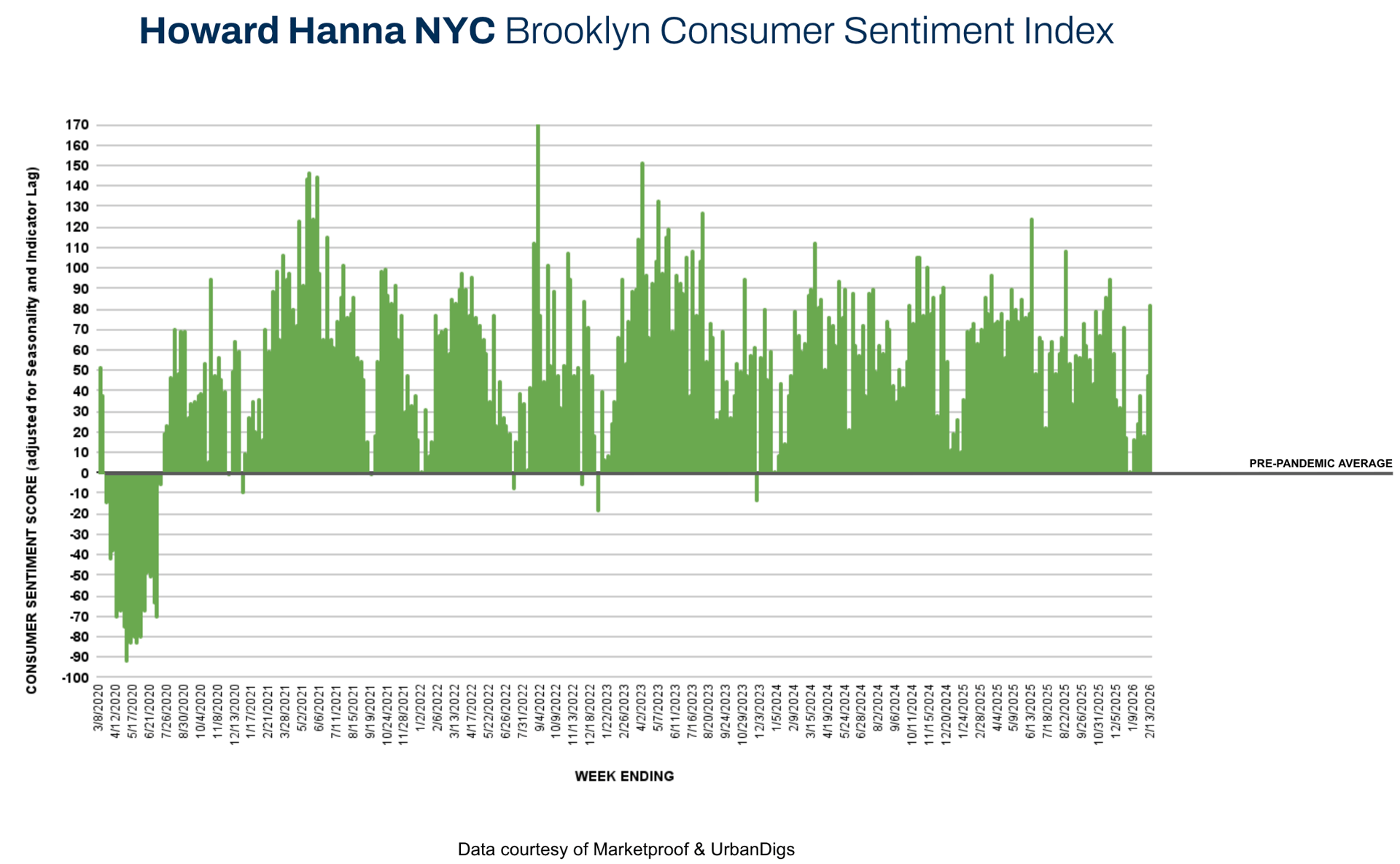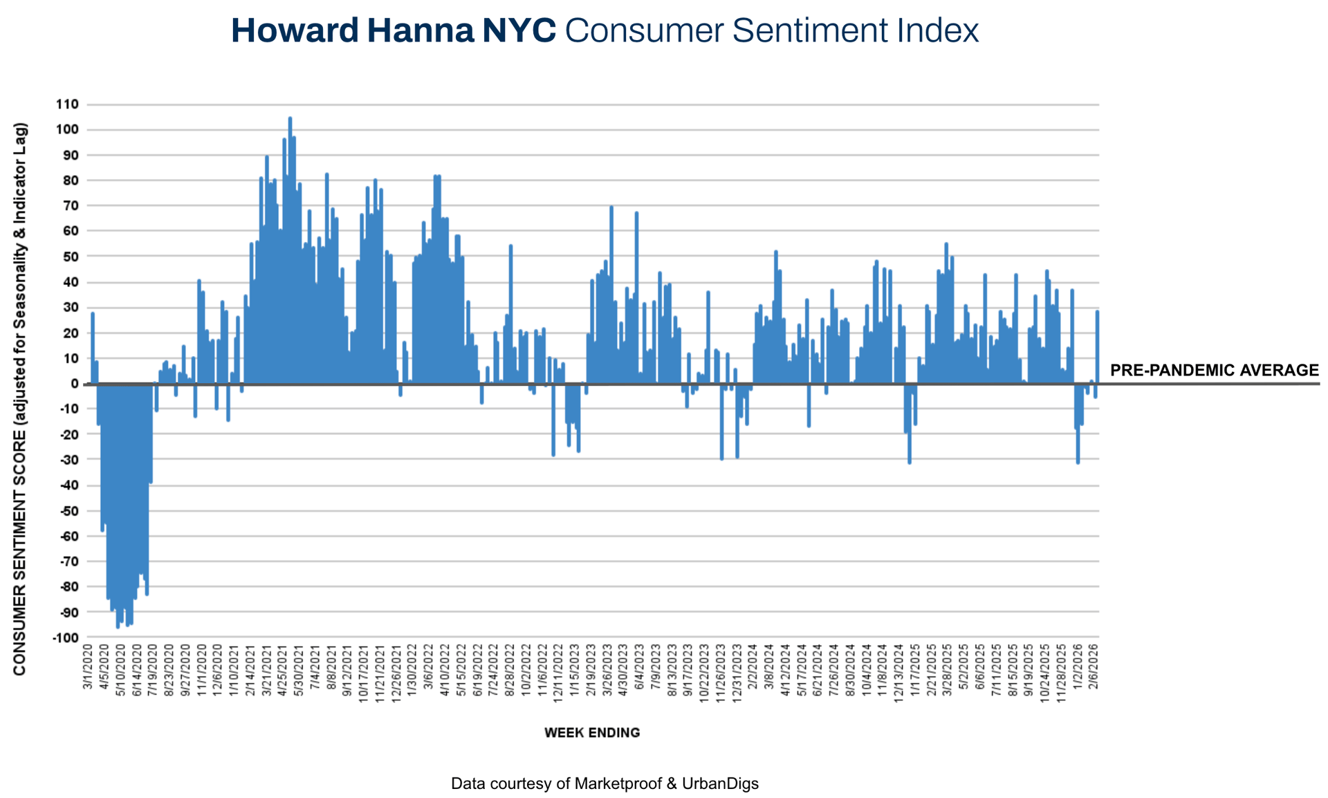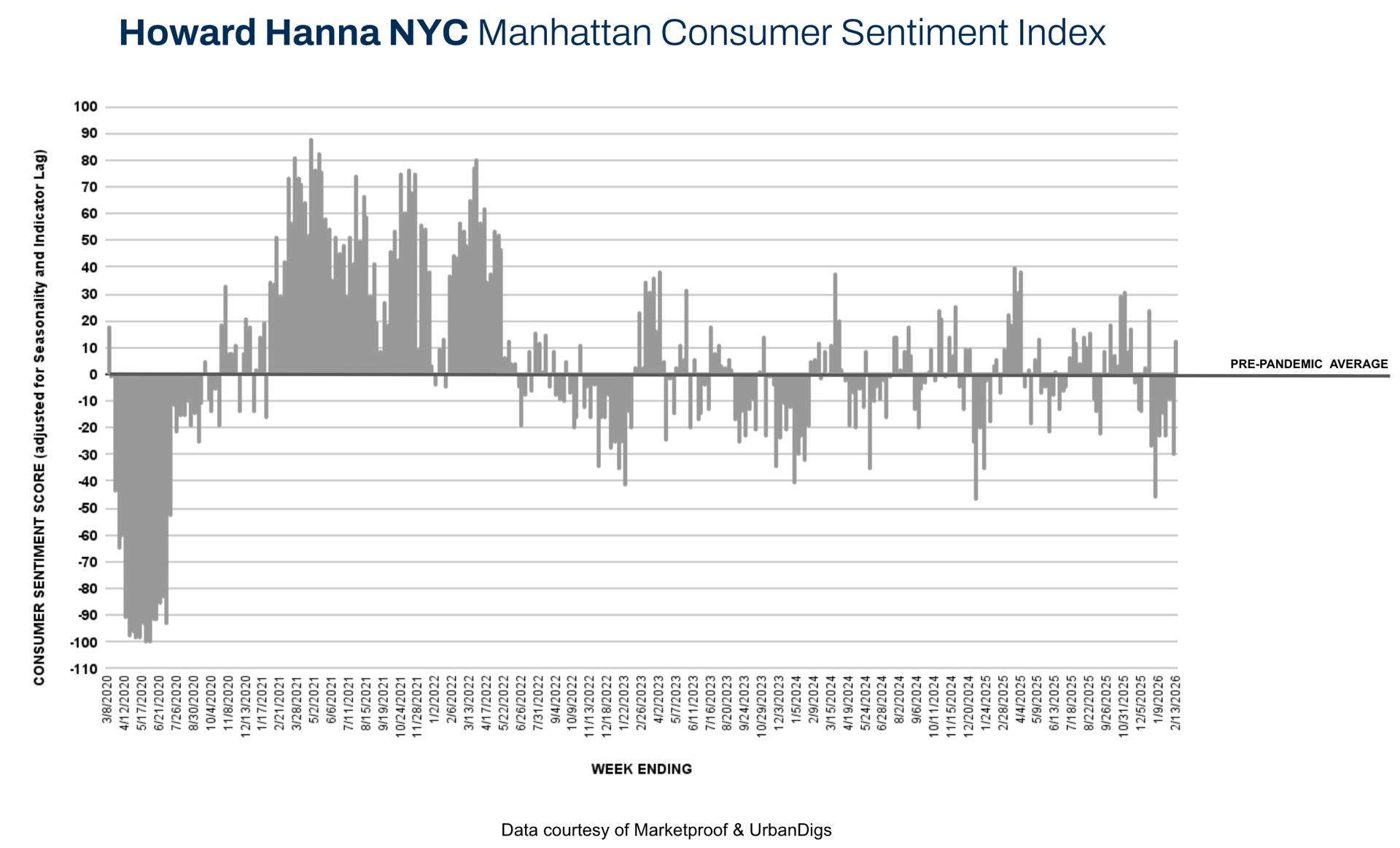 Market momentum accelerated meaningfully this week as contract activity expanded across both boroughs, signaling that buyers are stepping back into the market ahead of the spring season. The Howard Hanna NYC Consumer Sentiment Index increased sharply from –5% to +29%, underscoring a clear improvement in buyer confidence.