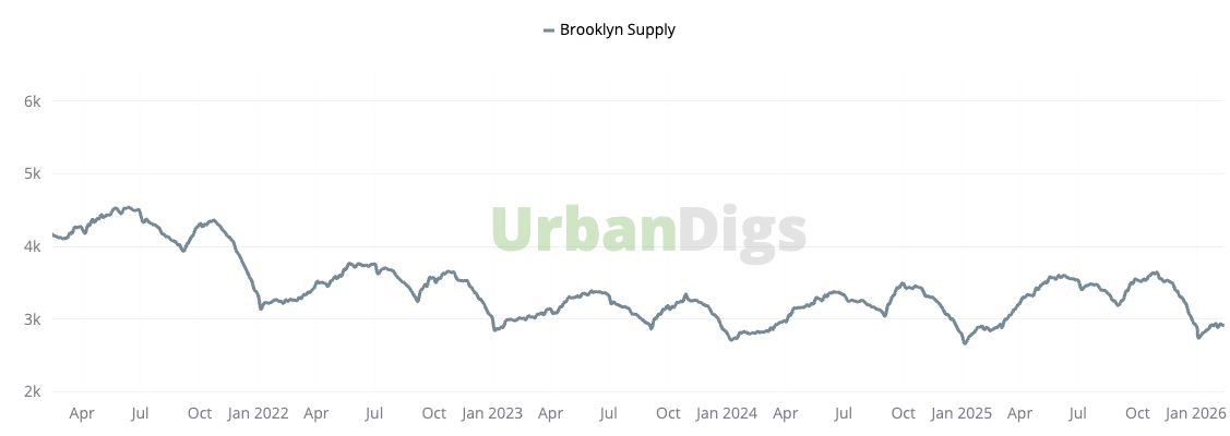 Brooklyn inventory increased slightly to 2,919 homes (+0.1% WoW | +2.5% YoY), effectively stable week over week but showing annual growth. New listings edged higher to 159 units (+2.6% WoW | +18% YoY), signaling that mid-February is beginning to unlock additional supply. Brooklyn’s supply growth remains measured and orderly.