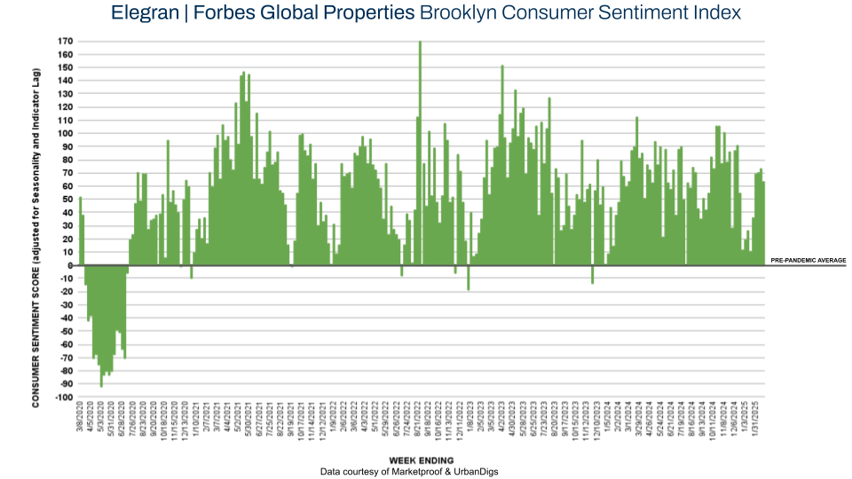 Despite a 5% dip in contract signings to 121, Brooklyn’s market remains resilient. The Elegran | Forbes Global Properties Brooklyn Consumer Sentiment Index held strong at +64, down slightly from +73 but still signaling robust market confidence. This sustained optimism underscores Brooklyn’s enduring appeal and buyer confidence in its long-term value.
