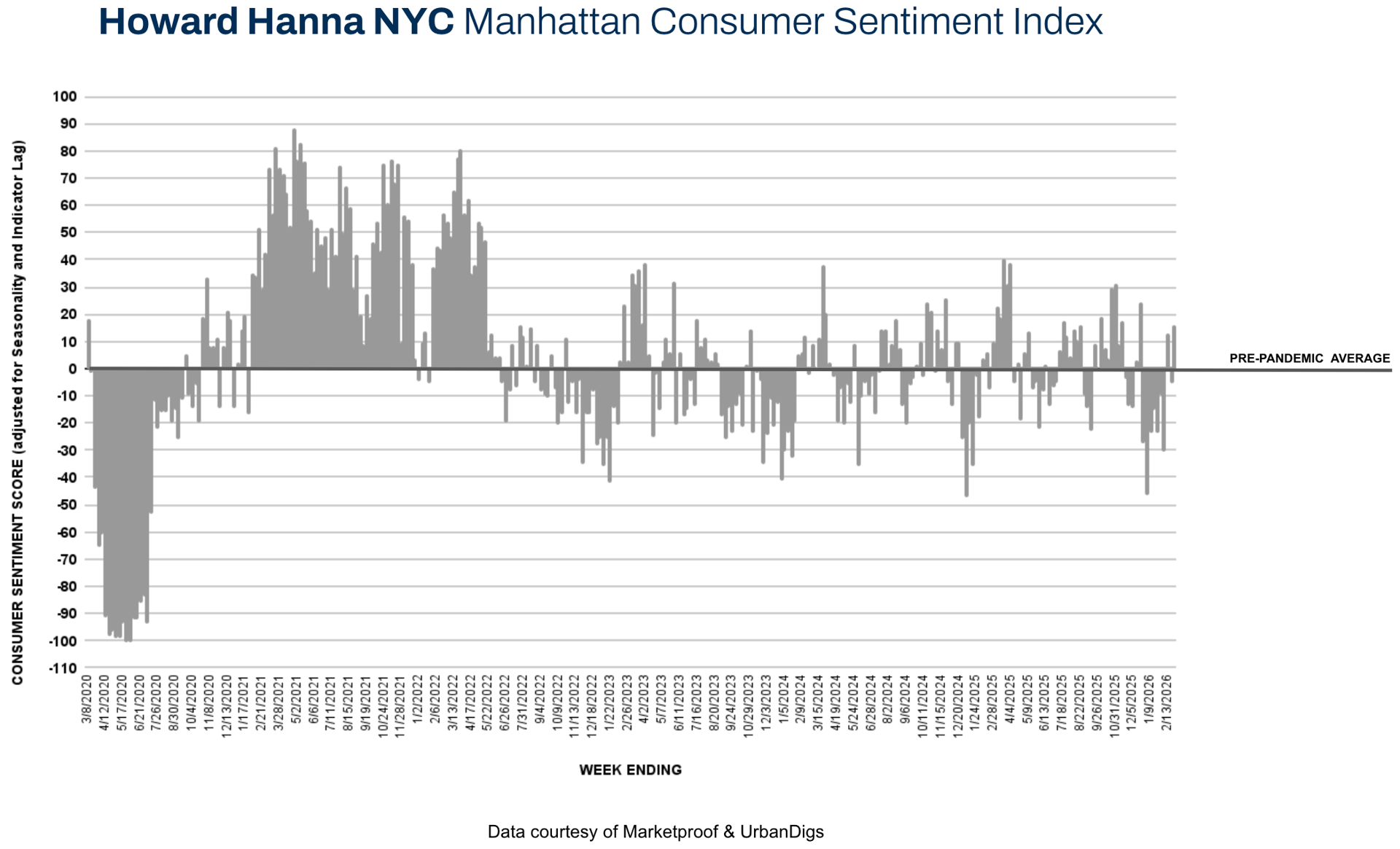 Manhattan recorded 234 signed contracts (+23% WoW | +5% YoY). The Howard Hanna NYC Manhattan Consumer Sentiment Index improved from -5% to +16%, moving decisively back into positive territory. The data confirms strengthening demand as February closes, positioning Manhattan for an active early spring cycle.