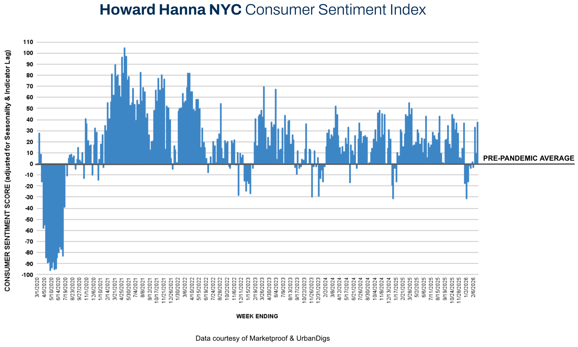 After mid-month moderation, the market regained traction in the final week of February. The Howard Hanna NYC Consumer Sentiment Index increased from +9% to +38%, reflecting a decisive improvement in signed contract activity across both boroughs. Momentum appears to be building ahead of the traditional spring acceleration period.