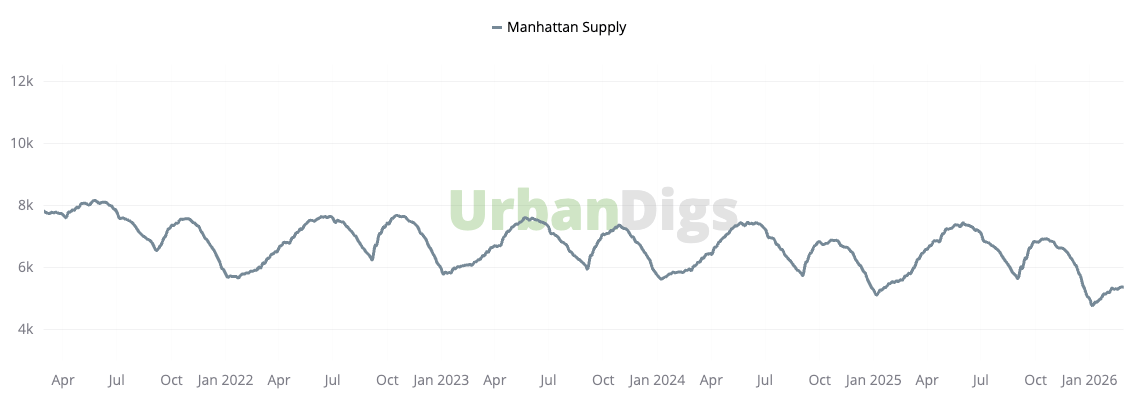 Manhattan active inventory increased slightly to 5,376 homes (0.5% WoW | –7% YoY). Supply remains structurally below 2025 levels. New listings declined to 262 units (-4.4% WoW | –29% YoY). Both weekly and annual listing volumes indicate continued seller caution.