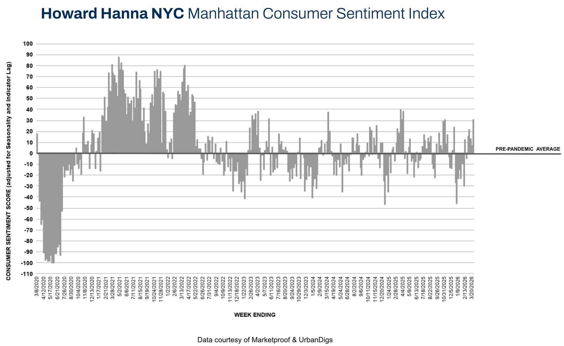 The Howard Hanna NYC Manhattan Consumer Sentiment Index increased from +7% to +30%, remaining in positive territory for the fifth consecutive week.